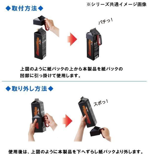 | 手が濡れているときでも片手で持ちやすく、お酒を注ぎすぎたりこぼしたりすることを防止できる酒パックホルダーです。手の小さい方、力の弱い方にも持ちやすく、注ぎやすい!! ※本体、取っ手は分解状態でのお届けになります。お客様で組み立ててご使用ください。 |