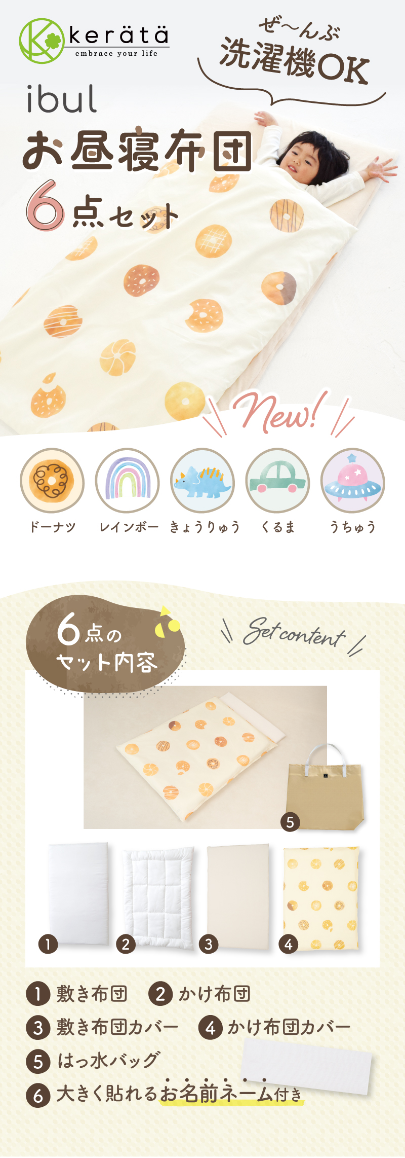 | 新生児から使えますか? | ケラッタのお昼寝布団の敷き布団は、適度な柔らかさにこだわった3層構造設計(綿・固綿・綿)となっておりますため、2歳頃からの使用を推奨しています。 |