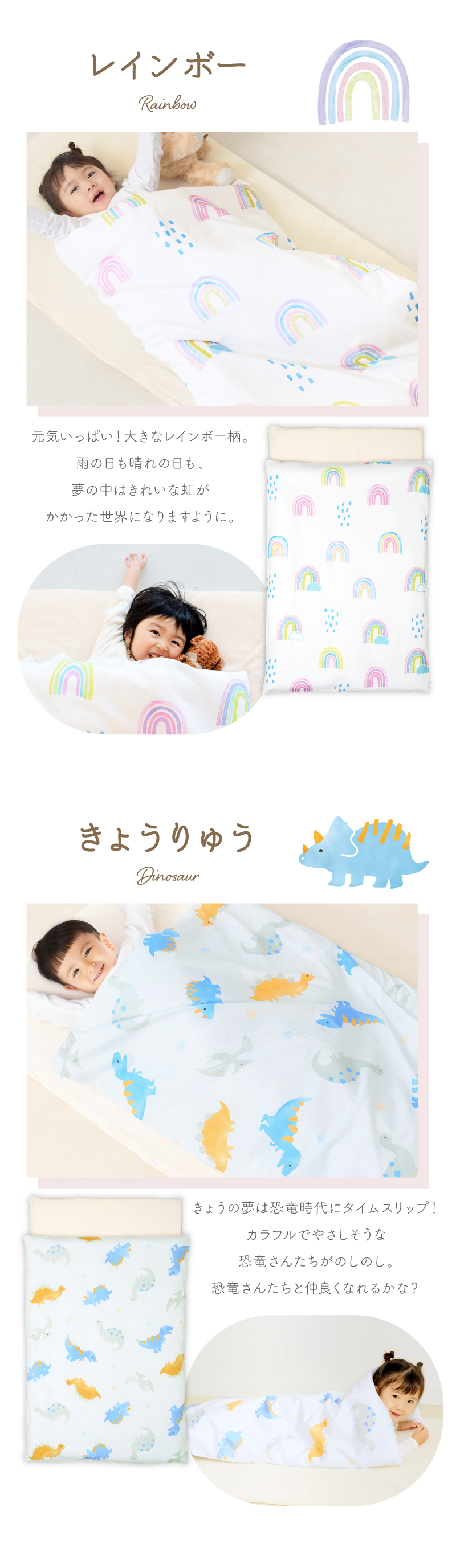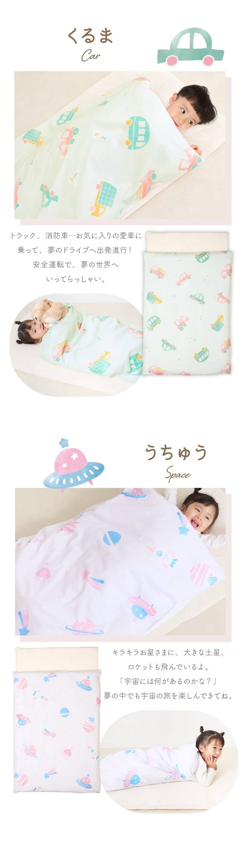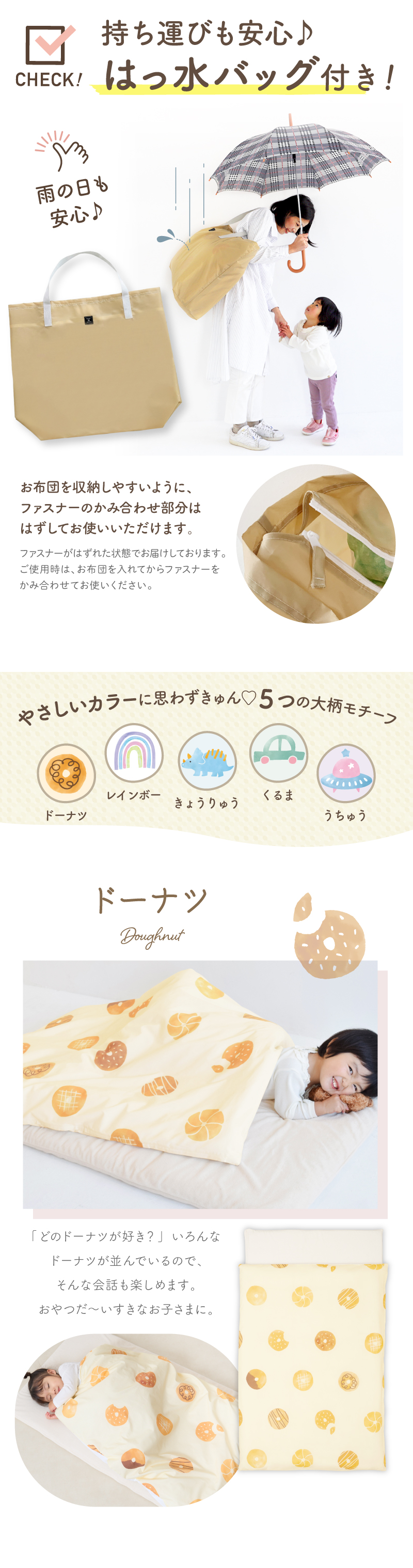| SPEC | サイズ: かけふとん : 75×105cm(カバー : 79×110cm) 敷きふとん : 70×120×3.5cm(カバー : 75×125cm) はっ水バッグ : 40×70cm お名前ネーム : 10×30cm |