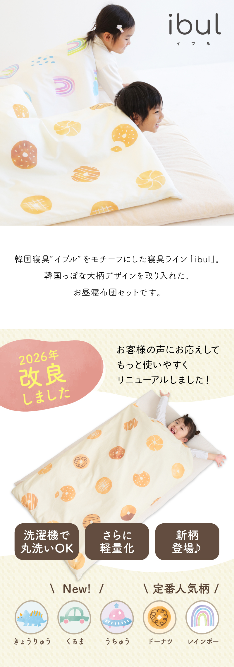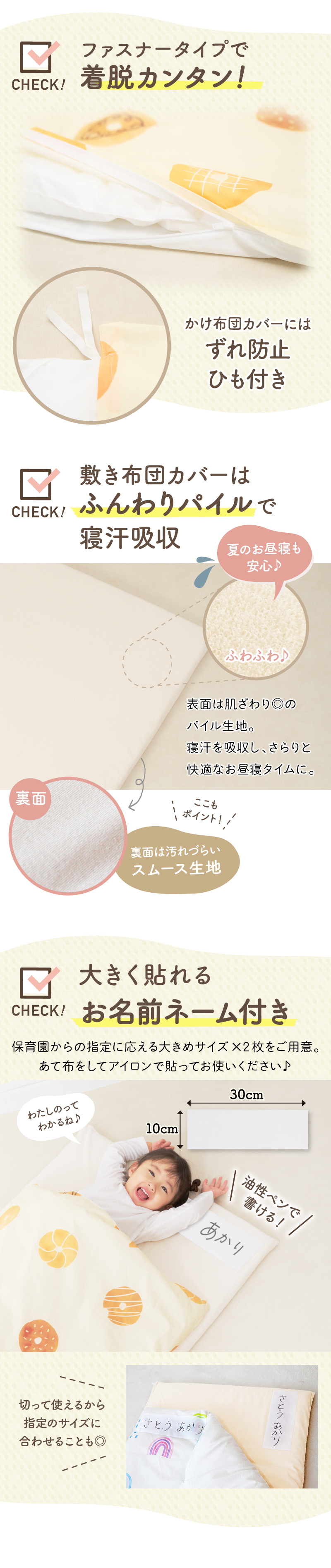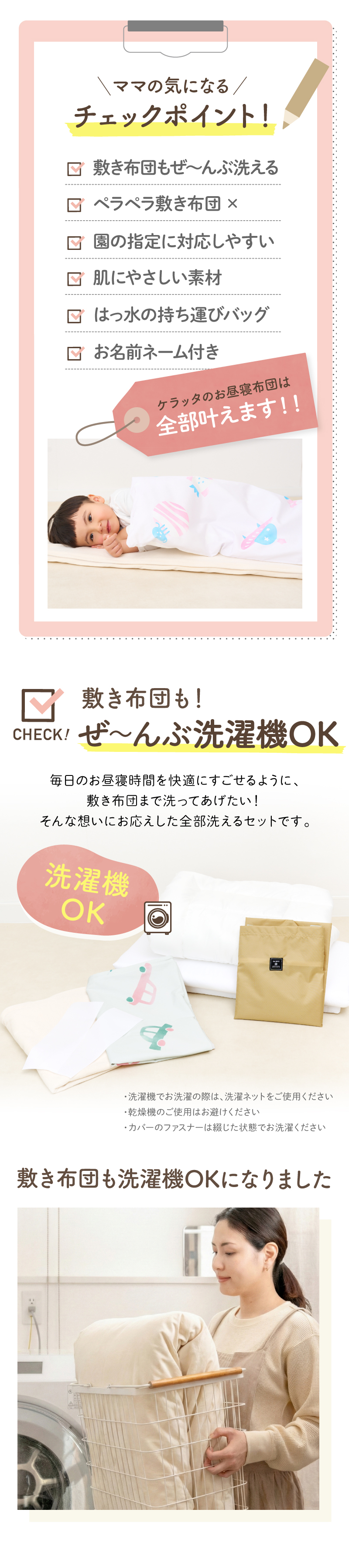 | SPEC | サイズ: かけふとん : 75×105cm(カバー : 79×110cm) 敷きふとん : 70×120×3.5cm(カバー : 75×125cm) はっ水バッグ : 40×70cm お名前ネーム : 10×30cm |