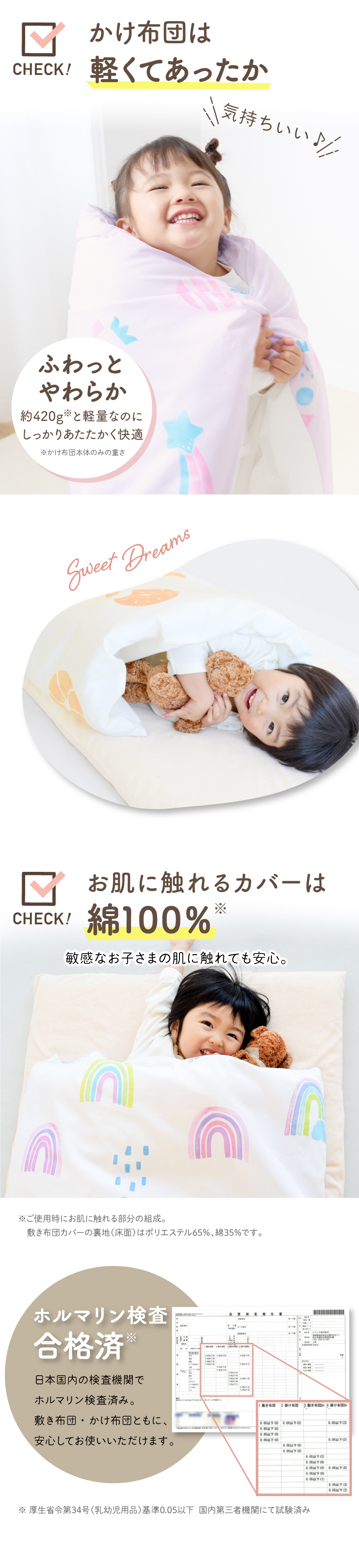 | 素材 | かけ布団カバー : 綿100% かけ布団 : ポリエステル100% 敷き布団カバー : 表パイル地 綿100% 裏地 綿35%ポリエステル65% 敷き布団 : ポリエステル100% バッグ : ポリエステル10% |