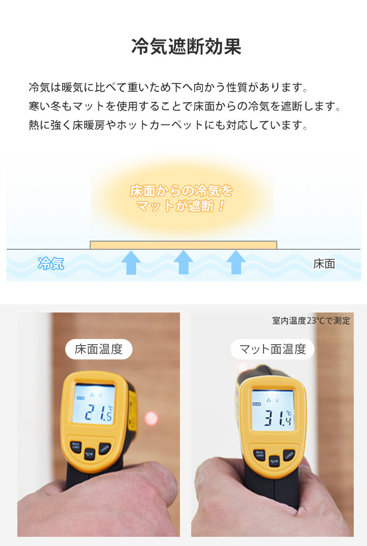 | 注意点 | ◆ご購入前 ・商品を複数回または複数個ご購入された場合、生産ロットや入荷時期等の理由により、色、質感、加工、柄パターン等に差異がある場合がございますのでご了承ください。 商品差異が気になる場合はご購入前にお問い合わせください。可能な限りご希望に添えるよう努力いたします。 ・お買い物ガイドをお読みのうえご購入ください ・サイズ表をお確かめの上ご購入ください。 ・ご利用のデバイスやPCモニターのカラー設定等により若干異なった色に見える場合がございますが、何卒ご了承ください。 ◆ご購入後 ・梱包箱、内袋等は返品・交換・返送の際に必要です。破棄されますと返品できない場合がありますので、商品の中身の確認が済むまでは保管してください。 ※不良品であっても対応をお受けできなくなる場合がありますのでご注意ください。 ・商品が届きましたら、お早めに商品のご確認をお願いいたします。 ・商品到着後、1週間を過ぎたご返品は基本的にお受けできません。 ・不良箇所があった場合は拭き取りや修正をする前に撮影し、店舗への連絡時に添付してください。 ・返送いただいた商品に不具合・不足品があった場合は別途費用が発生する場合がございます。 ◆ご使用時の注意事項 ・開梱の際カッター等をご使用される場合は商品を傷つけないようにお気をつけください。 ・サイズにつきましては±3%の誤差は許容範囲内として販売しております。 ・輸入品のため梱包のダンボールに汚れや臭いがある場合がございます。また税関の際、中身の確認のため一度商品が開けられている場合がございます。ご了承下さい。 ・火気に近付けないでください。こたつ、ホットカーペットなど高温になる可能性のある暖房器具と併用する際はマットに熱がこもらないようにご注意ください。 ・水や湿気はカビや臭いの原因となりますのですぐに乾いた布で拭いて風通しの良い所にマットを立てて乾燥してください。 ・クッションマットは低反発素材ではないため、家具などを長時間置いた場合、マットのくぼみが完全に戻らなくなる場合がございますので ご注意下さい。 ・まれに梱包ビニールの臭いがマットについている場合がございますが、風通しの良い場所で干すことで無くなります。 ・汚れた場合はウエットティッシュや濡れ布巾などで拭き、自然乾燥させてください。 ・油性ペン、ボールペン、色鉛筆の汚れは落ちない場合があります。 ・色落ちしやすい衣類(デニム等、レギンス、ストッキング)、コーヒーや飲料、果物がマットに色移りすると落ちない場合がありますのでご注意ください。 ・スチームクリーナーやマットの水洗いは生地の損傷を招く恐れがあります。 ・防カビ加工の製品でも高温・多湿の状態で放置すると、カビが発生しやすくなります。長くお使いいただくために、定期的にマットを立てて乾燥させてください。 |