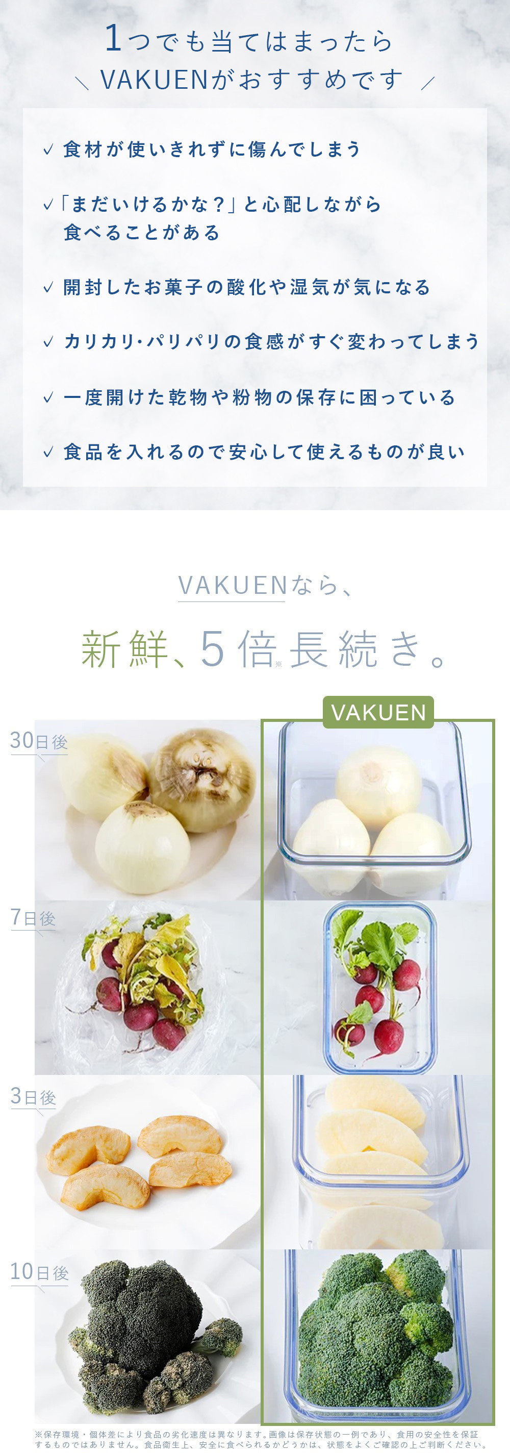 | FAQ | Q1. 容器の中に水気があるのはなぜですか? VAKUENは真空密閉をするので、内部に野菜などを入れると食材が噴き出すガスで容器の中は暖かくなります。 容器内は暖かく、冷蔵庫に面した容器の外側は冷たいため、科学的な現象で内部に水気が出るようになります。 Q2. 充電時間と使用可能時間はどのくらいですか? 約2時間充電で約60分(約100回) 使用できます。 (高速充電不可) Q3. 食器洗浄機で洗えますか? 優れた耐久性のため、食器洗浄機に入れて洗っても大丈夫です。 (真空ポンプは機器のため、洗浄できません) Q4. オーブンで使えますか? オーブンは対応していません。オーブンに入れたり、加熱したりするのは避けてください Q5. 電子レンジに使えますか? 2分以内でご利用いただけます。 Q6. 冷凍庫に入れても大丈夫ですか? -30度~100度まで耐えられる素材のため、冷蔵・冷凍保存できます。 |