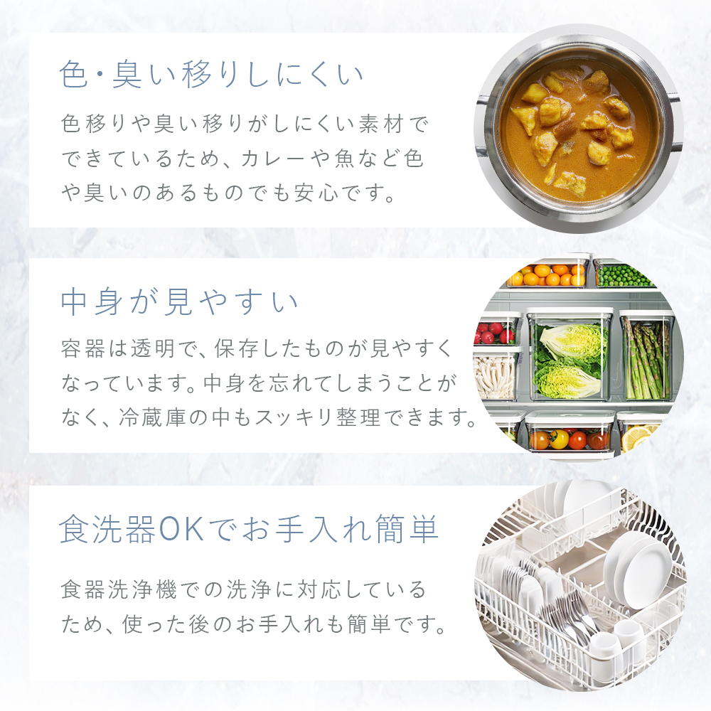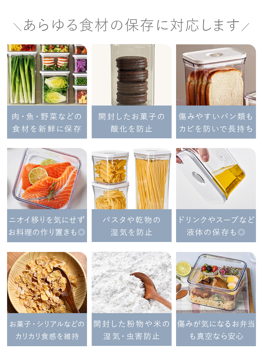 | 使用上の注意事項 | ●初めてご使用の際は、真空ポンプの充電を最低2時間以上行ってからご使用ください。 ●真空ポンプを充電する際は、必ず5V/1Aのアダプターをご使用ください(高速充電器は使用できません)。 1A出力以上を要する充電器では、電源ランプが点滅せず、正常に充電ができません。 また、長時間ケーブルを差し込んだままにすると故障の原因となるほか、バッテリーの寿命が短くなるおそれがあります。 ●通常、真空はボタンを押してから数秒から10秒程度で作られますが、容器のサイズや入れる食材の量によっては、これより長くかかる場合があります。 ●作動中に任意で中断したい場合は、再度電源ボタンを押してください。 ●真空ポンプの作動が止まった状態で再度電源ボタンを押すと、容器が気圧差に耐えきれず破損するおそれがあります。絶対におやめください。 ●食材がエアバルブの内側に接触していたり、近すぎる場合、真空になるまで時間がかかったり、バルブが外れてしまう原因となることがあります。食材の位置にはご注意ください。 ●シリコンパッキン部分に粉ものや汚れが付着していると、蓋がきちんと閉まらなかったり、真空状態が不安定になったりすることがあります。 ご使用前に、シリコンパッキンと容器の接着面をきれいに拭き取り、汚れを取り除いてからご使用ください。 ●バナナ、漬物、キムチ、焙煎したてのコーヒー豆など、ガスを多く排出する食材の真空保存は推奨しておりません。 ガスが容器内に溜まることによって、かえって食材の劣化が早まる恐れがあります。 また、容器内のガスで蓋が押し上げられ、真空状態が解除される恐れがあります。 使用する場合は、こまめに状態を確認し、必要に応じて再度真空処理を行ってください。 ガスを多く発生する食材を保存する際は、保存途中で蓋を開けて中の状態を確認してください。 ●ペットフードを保存される場合、ペットフードに含まれる油分が時間の経過とともに容器素材へ影響し、ひび割れの原因となる可能性がございます。 そのため、ペットフードを保存される際には長期保存を避け、容器や中身の状態に十分ご注意ください。 ●食品の劣化速度は保存環境・食材の個体差により異なります。 画像は保存状態の一例であり、食用の安全性を保証するものではありません。 食品衛生上、安全に食べられるかどうかは、状態をよくご確認の上ご判断ください。 賞味期限・消費期限がある食品は、必ず表示に従ってください。 ●シリコン部分は素材の特性上、においや色が移る場合があります。 においや色移りが気になる場合は、長時間直射日光にさらすことで軽減されることがあります。 |
