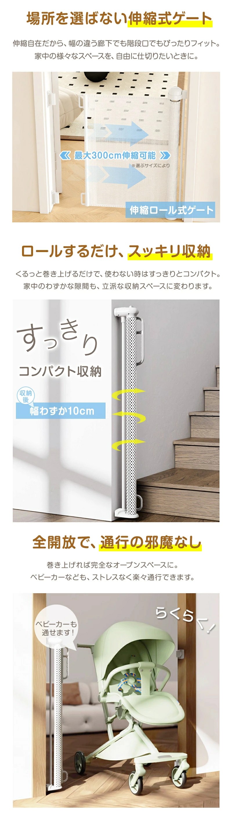 | 👶【安心の見守りアイテム】 ロール式ベビーゲート 伸縮タイプ 🔒穴あけ不要&最大300cm対応 👫赤ちゃん・ペット兼用 |