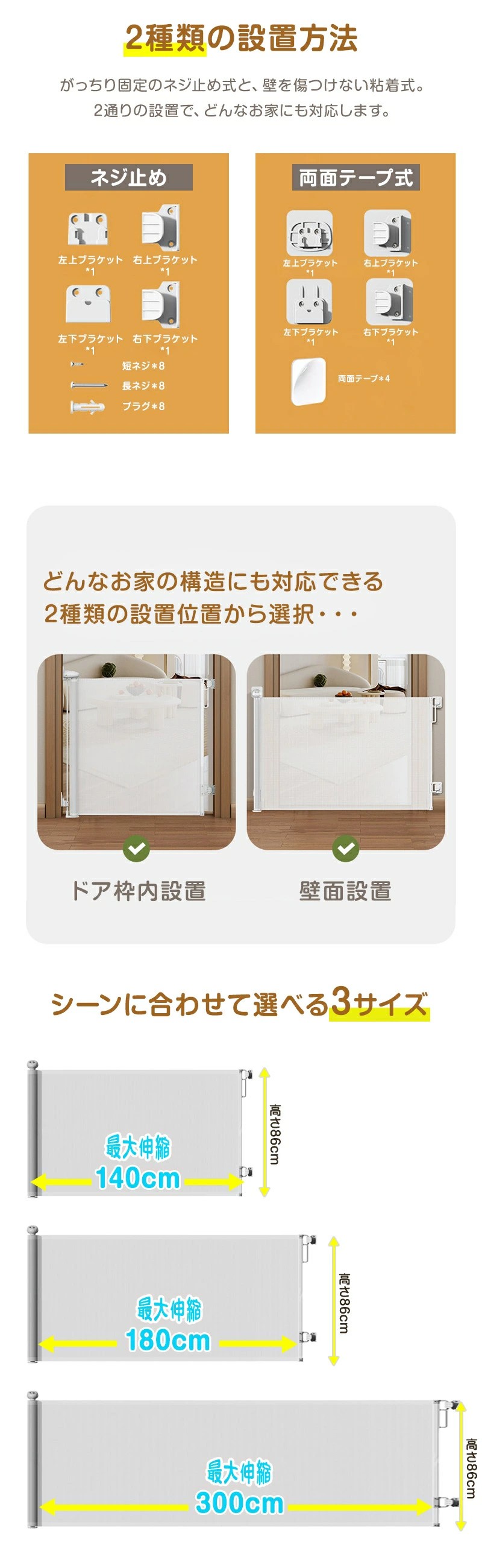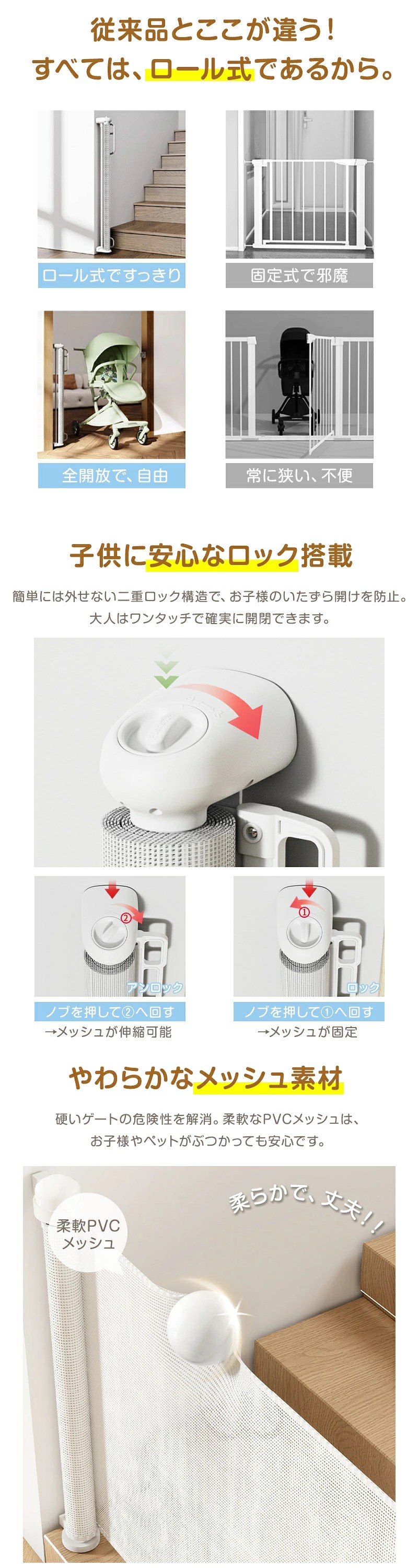 | 🚀お子様やペットの安全対策に最適なロール式ベビーゲート。 📌最大約300cmまで伸縮可能で、階段上・玄関・キッチンなど幅広い場所に対応。 🔒しっかりガードしながらも、使わない時はスッキリ巻き取り収納が可能。 🔧穴あけ不要で設置できるため、壁を傷つけず賃貸でも安心して使用できます。 👶赤ちゃんの転落防止や侵入防止に大活躍。 🐶犬や猫などペット用ゲートとしても兼用OK。 シンプルで圧迫感のないデザインだから、お部屋の雰囲気を損なわず設置可能。 ワンタッチ操作で開閉もラクラク、毎日の育児や生活をしっかりサポートします。 家族みんなの安心・安全を守る必須アイテムです。 |