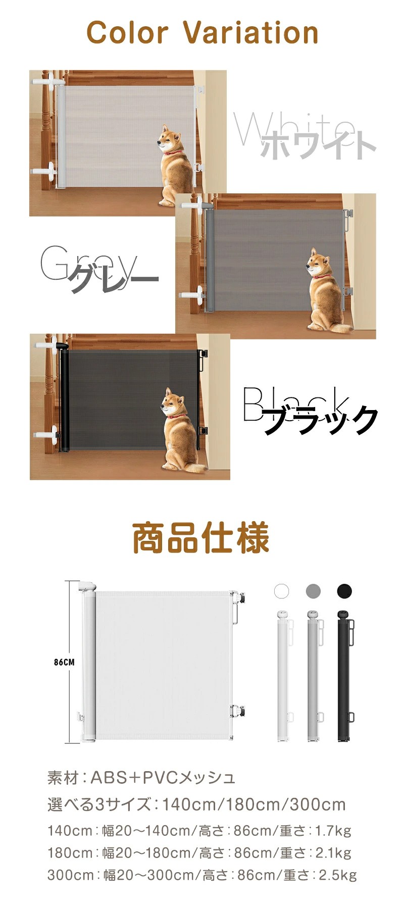 | ・対応サイズ:140cm/180cm/300cm ・対応幅:約20〜140cm/180cm/300cm ・高さ:86cm(共通) ・重量:約1.7〜2.5kg(記載) ・カラー:ホワイト/グレー/ブラック ・タイプ:ロール巻き取り |