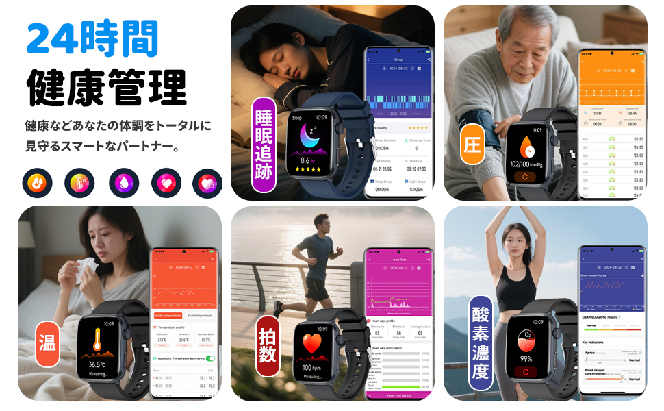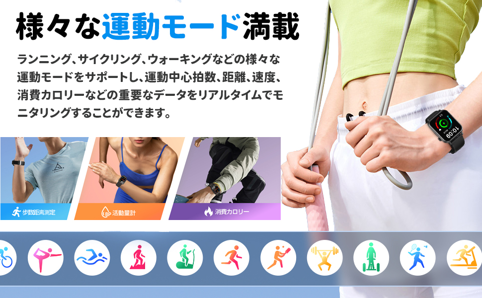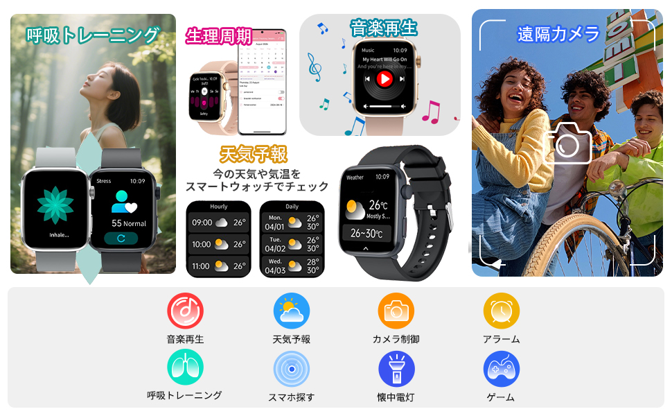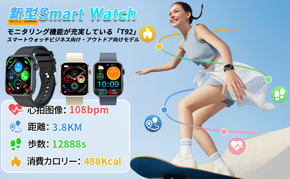 毎日の歩数や距離、カロリーを記録するだけでなく、座りがち注意、飲水注意、薬を飲む注意リラックス、睡眠質を記録などの機能も備えています。女性の健康のために、女性の月経周期の記録と通知機能も揃えます。スタイリッシュなデザインは職場や生活の中でレディースもメンズも使用いただけます。スマホ探す、リモコン撮影 、アラーム、タイマー、ストップウォッチ、腕上げ点灯、画面の明るさ調整、おやすみモード、天気予報、音楽コントロール、多言語対応などの便利機能が満載!IP68規格の防水&防塵性能を持ち、日常生活での手洗いや洗顔の際に取り外す必要がありません。注意:ダイビングや海水浴、サウナでの使用は避けてください。