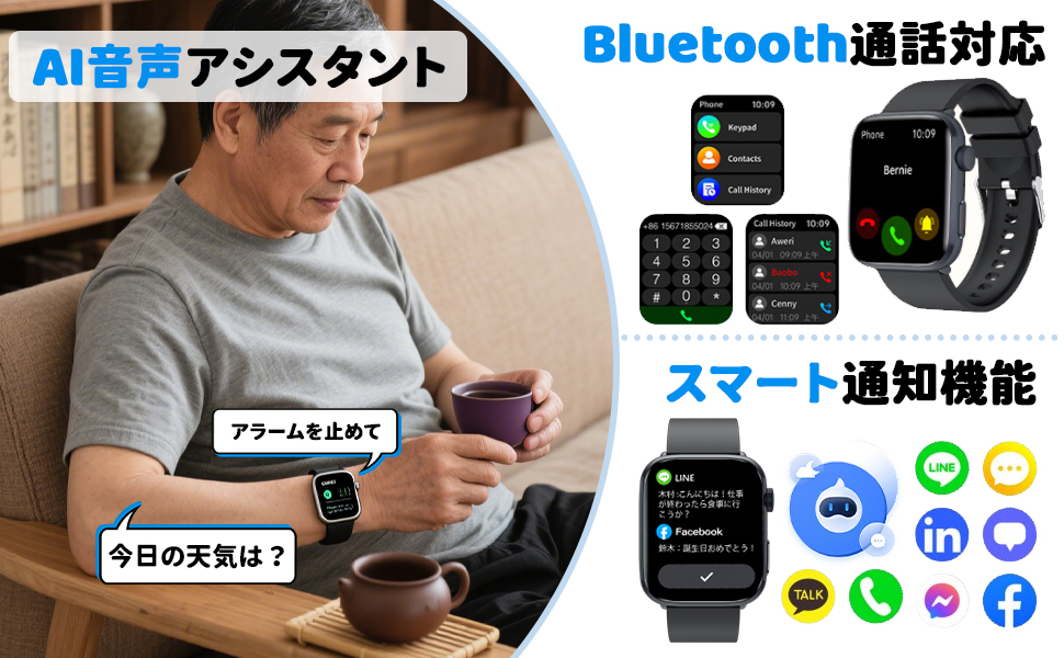 スピーカーと高性能マイクを内蔵し、スマホを取り出すことなく通話ができるスマートウォッチで、毎日の仕事や生活、ドライブに大きな利便性を提供します。専用アプリと接続すると、スマートウォッチから直接電話をかけたり、応答したり、スピーカー機能をオンにしたりできるほか、通話履歴の確認や通話履歴の保存も可能です。 通話相手の名前と電話番号が時計に表示されます。また、smart watchには音声アシスタント機能が搭載されています。 さらに、LINEやFacebook、Twitterなどの通知もお知らせしてくれるので、大切なメッセージを見逃すこともありません。通知の振動の強さは、時計側で設定できます。