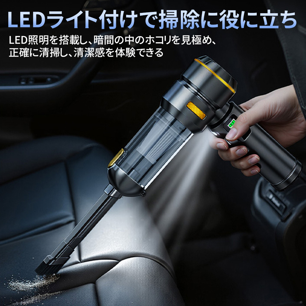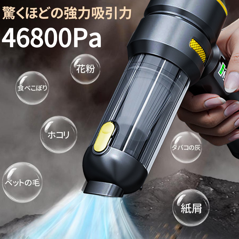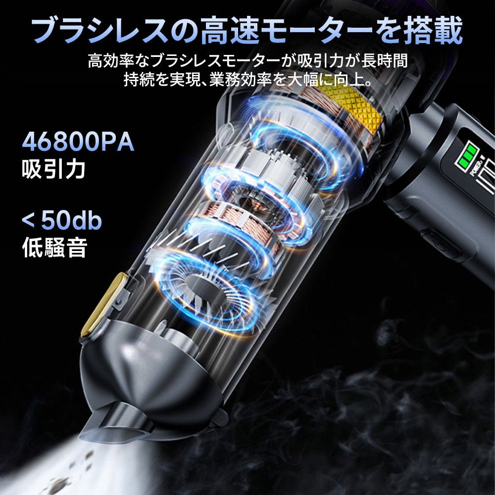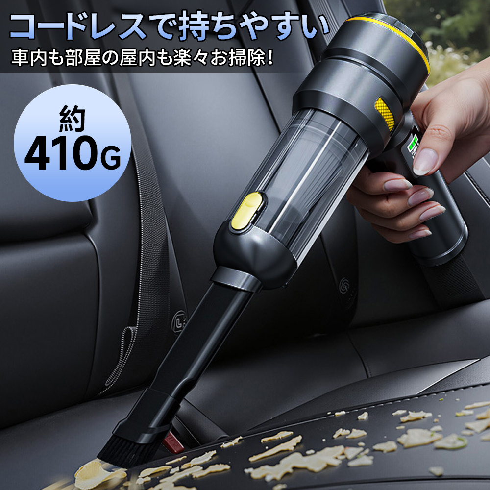 ブラシレスの高速モーターを採用して、約410g軽さながら最大46800PAの強力な吸引力で、食べこぼし、タバコの灰、粉末の物、ペットの毛、髪や車の中の小石などを手軽にお掃除可能です。部屋の隅々まで届きます、掃除はすべてお任せください。 コードレスで、掃除する時にゴチャゴチャしているコードからの邪魔がなく、愛車のクリーニングをスムーズに行えます。