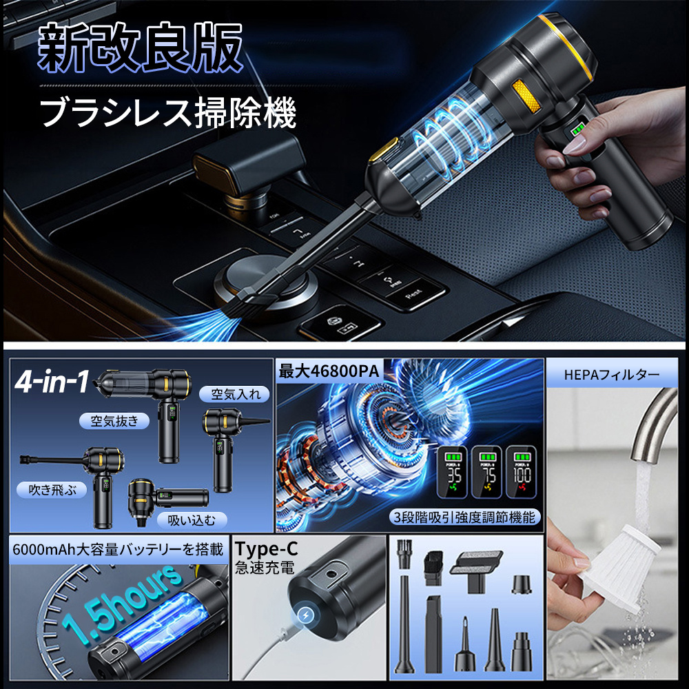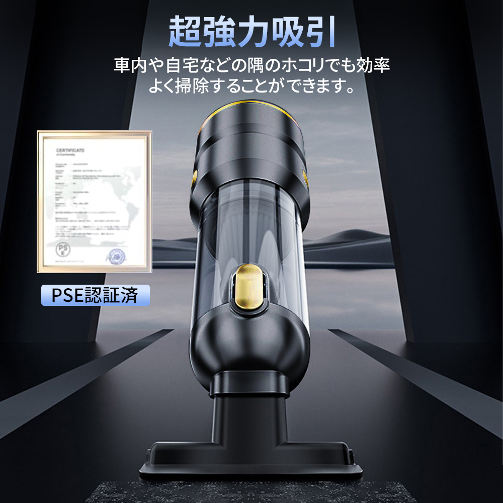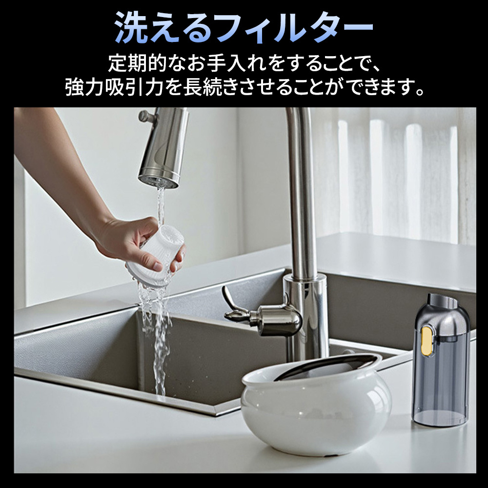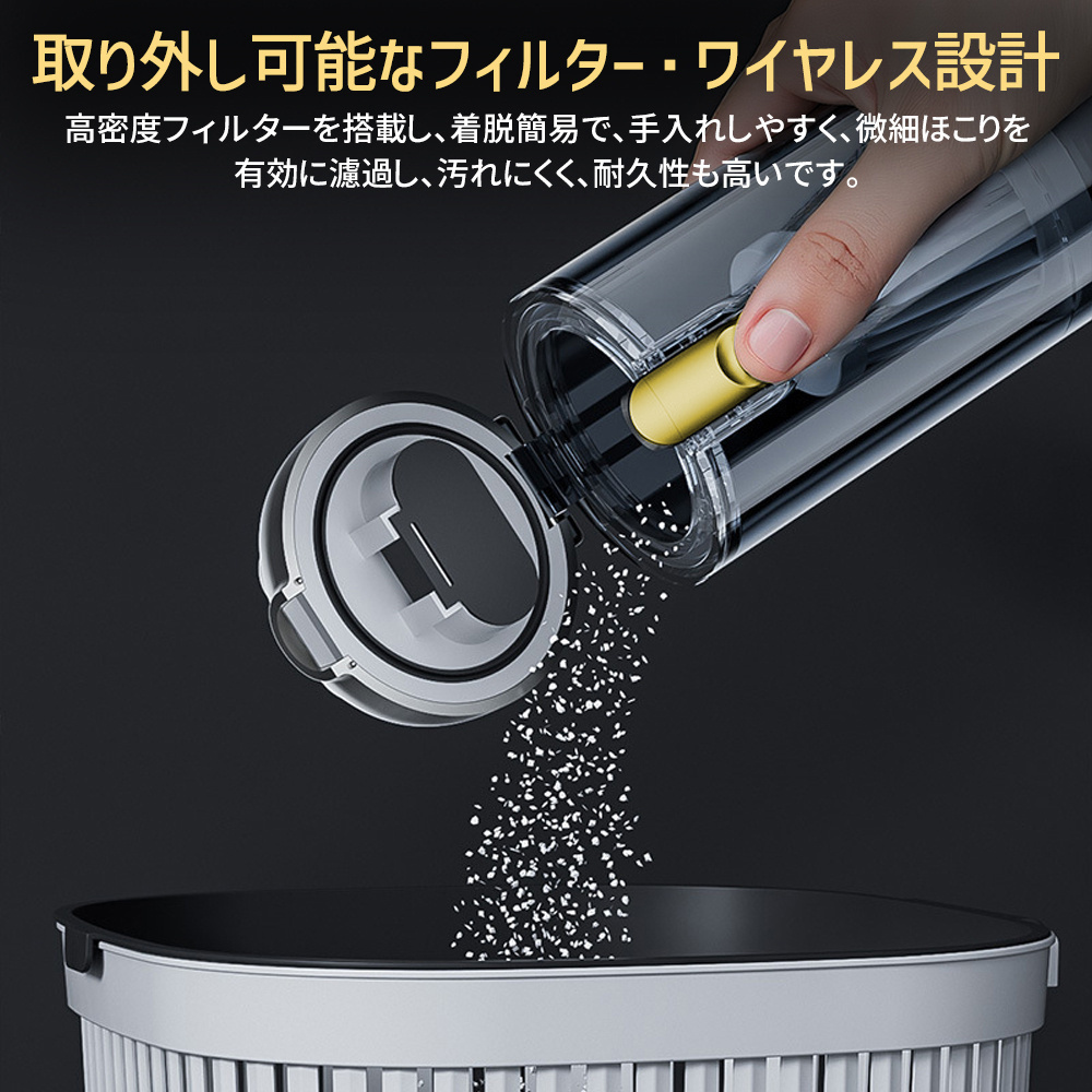 ブラシレスの高速モーターを採用して、約410g軽さながら最大46800PAの強力な吸引力で、食べこぼし、タバコの灰、粉末の物、ペットの毛、髪や車の中の小石などを手軽にお掃除可能です。部屋の隅々まで届きます、掃除はすべてお任せください。 コードレスで、掃除する時にゴチャゴチャしているコードからの邪魔がなく、愛車のクリーニングをスムーズに行えます。