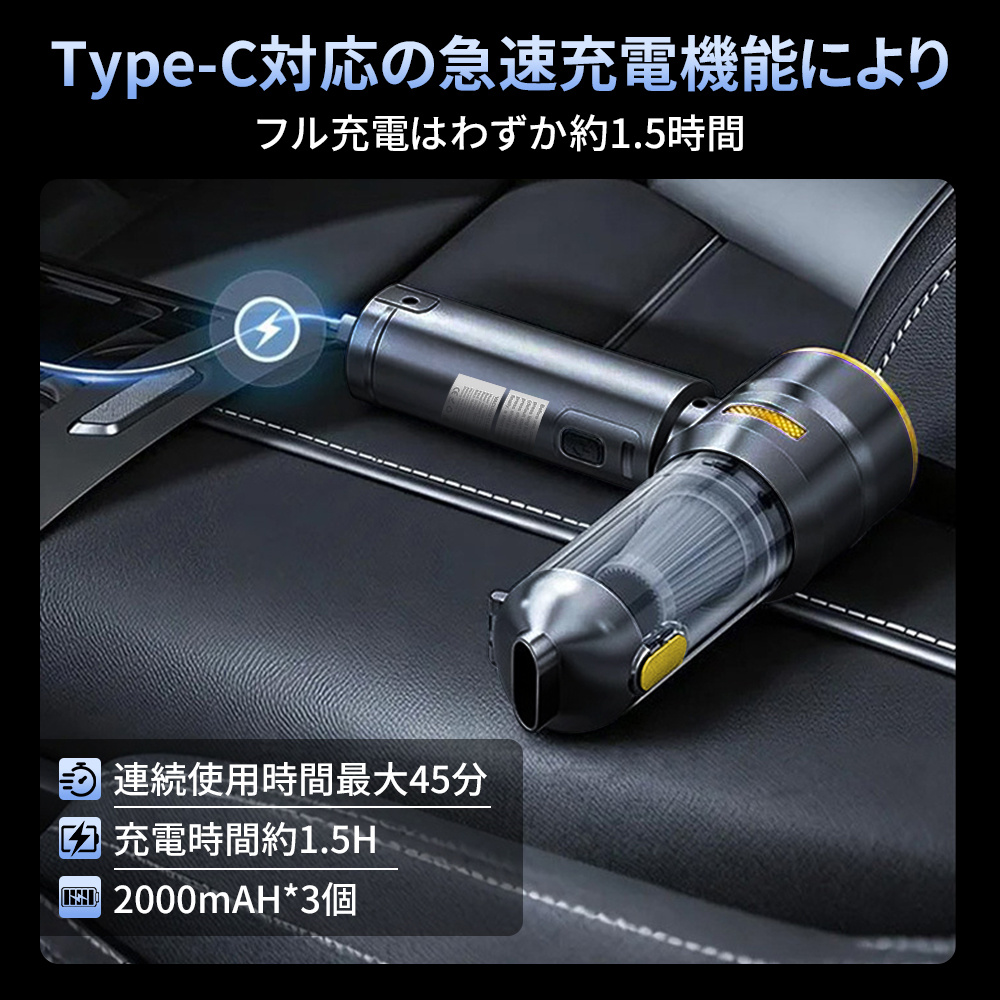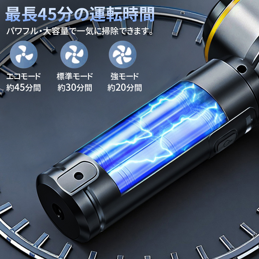 手軽さと充実のお掃除性能を両立した小型掃除機は、進級版大容量バッテリーを採用し、一回満充電すれば、最長45分間安定したパワフルな電力を供給し、しっかり掃除できます。小型掃除機でお気になる全体を一気に掃除できます!(充電時間は約2.5~3時間でフル充電でき、充電アダプターの仕様により異なります。高品質や信頼できるメーカーの充電器を選んでください。)