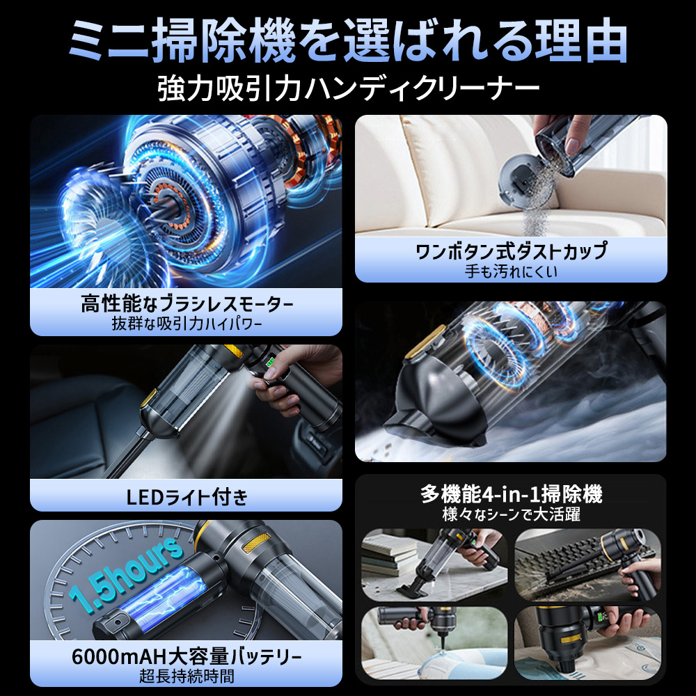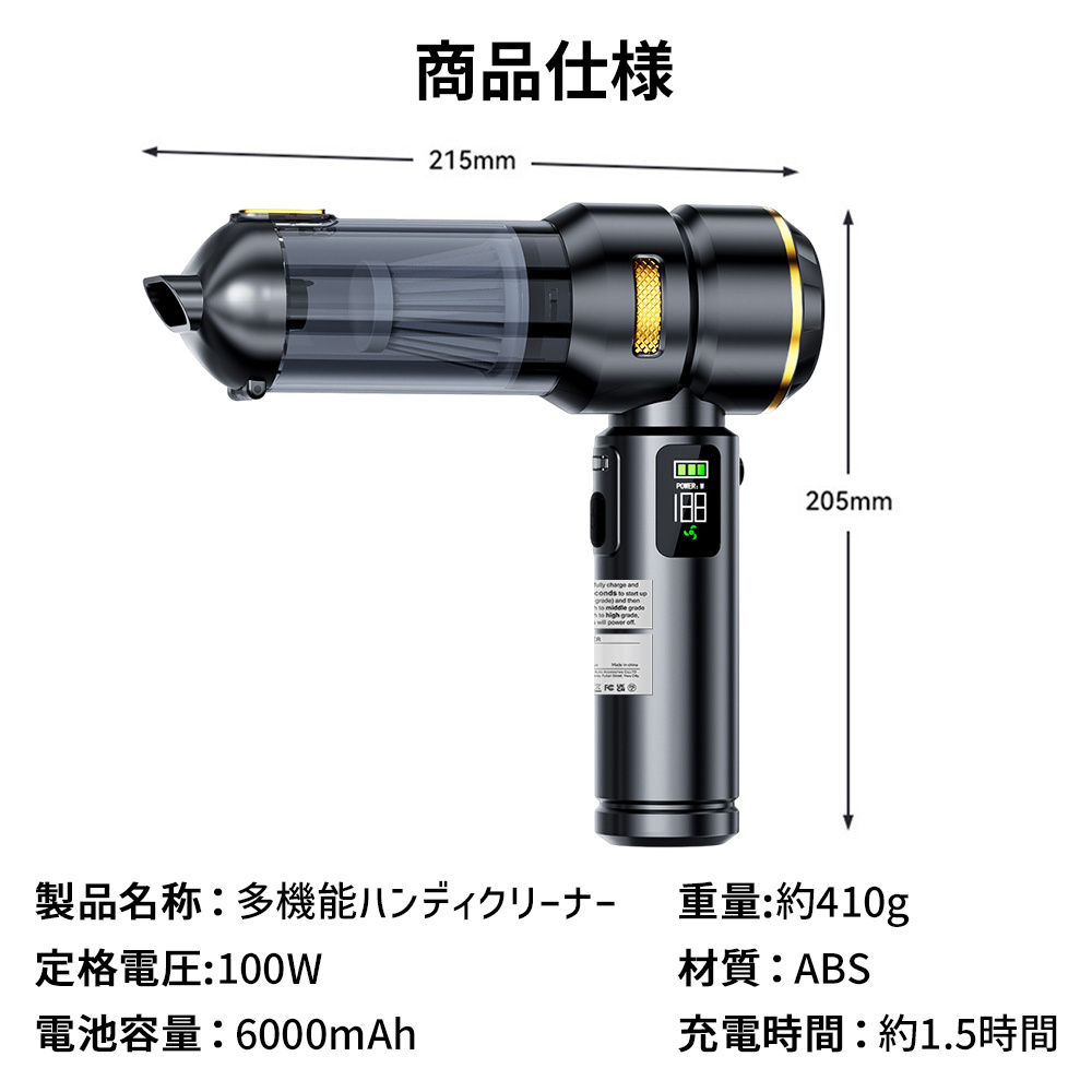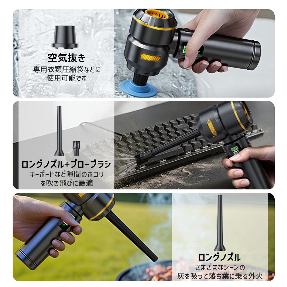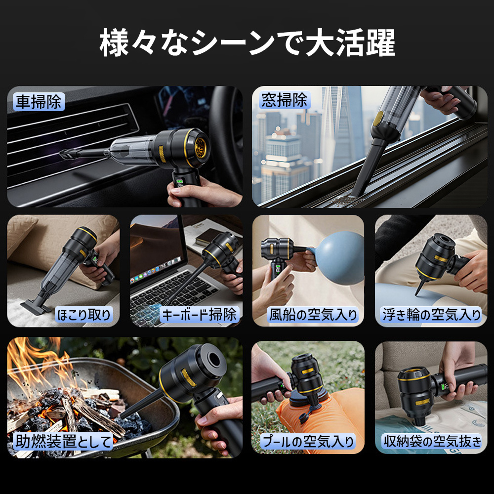1.吹き飛ぶ2. 吸い込む 3.空気入れ 4.空気抜き。このハンディクリーナーはミニ掃除機/エアダスター/電動エアーポンプとして利用可能です。ソファの隙間、キーボード、車内掃除、ネックピロー、エアベッド、エアボート、専用衣類圧縮袋などの場所に使用可能です。7種の交換用アタッチメントを備えて、ゴミの取り残しを軽減し、掃除の効率を高めます。車内/自宅兼用の小型掃除機です。