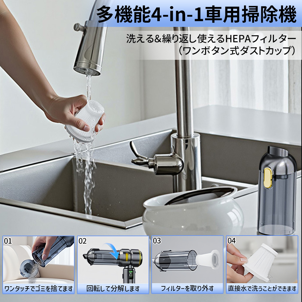 HEPAフィルターは、微細な粒子やアレルゲンを効果的に捕捉し、車内の清潔に保つ役割を果たします。車内に浮遊する埃、花粉、ハウスダストなどの微細な汚れを効果的に除去し、快適で健康的な車内環境を実現します。HEPAフィルターは高い性能を持ちながらも、再利用可能で経済的です。HEPAフィルターを搭載した車載用掃除機は、清潔さと健康を重視する最適な選択肢です。