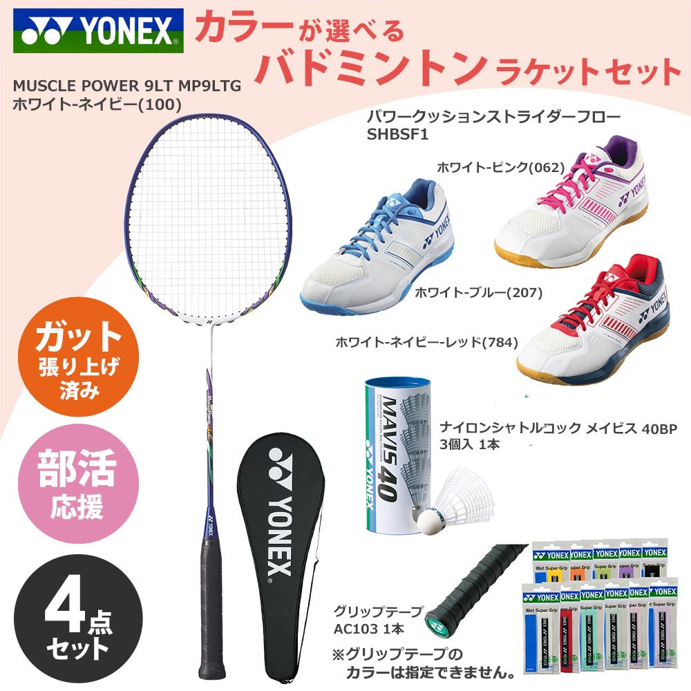 「ガット張り上げ済み」ヨネックス YONEX バドミントン 新入部員応援!部活応援4点セット ラケットMP9LTG+シューズSHBSF1+シャトル40BP+グリップテープAC103