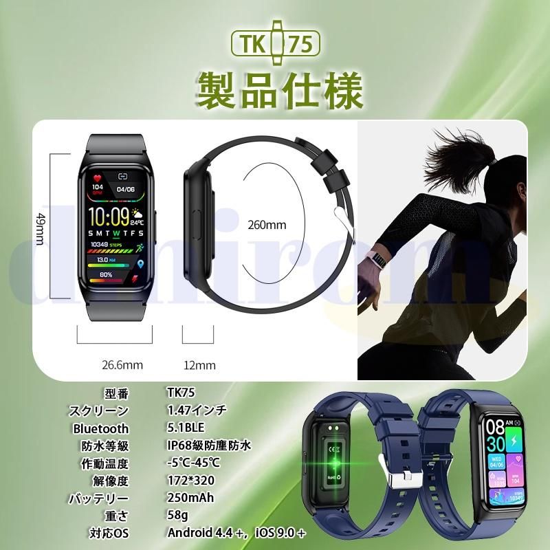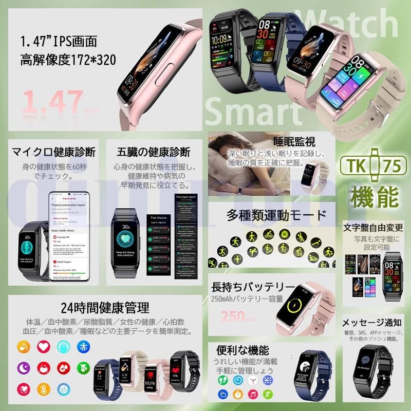 このスマートウォッチは業界初の1.47インチ大画面のタッチパネルを採用し、老眼の方にも見やすい!画質がより鮮明になり、高精度な大画面で通知や文字が一目瞭然に表示される。上下左右のスライド操作で機能の切替も簡単です。本体で6つの表盤画面搭載する以外、専用アプリで100+種類の文字盤を自由に設定することができます。他に、家族、恋人、アイドル、及びペット等の好きな写真も文字盤に設定可能で毎日新鮮さを味わえる。