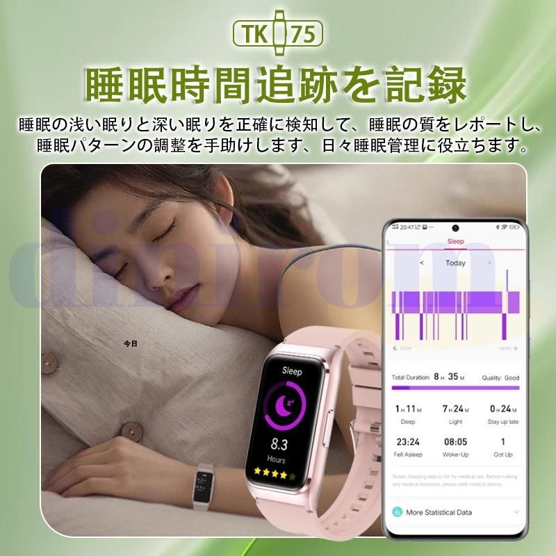 健康-測定、五臓脂肪検査、血中脂質、尿酸、血圧測定、24時間定時体温測定、高精度心拍数、血中酸素などの機能画面に切り替え、ワンタッチで測定を開始すると、測定結果が一目でわかります。また、自動測定機能をオンにすると、自動的にデータをアプリに同期させることができ、さらにAI分析が健康状態の把握に役立ちます。ただし、本デバイスは医療机器ではありませんので、提供するデータはあくまでリスク評価用ですので、予めご了承ください。このウォッチは、深い睡眠、軽い睡眠、レム睡眠を記録するだけでなく、専用アプリが睡眠状況を詳細に分析し、睡眠の質に応じた睡眠アドバイスを提供します。普段は目に見えない睡眠の質を知れば、よりよい睡眠を意識した健康的な生活を送りやすくなります。