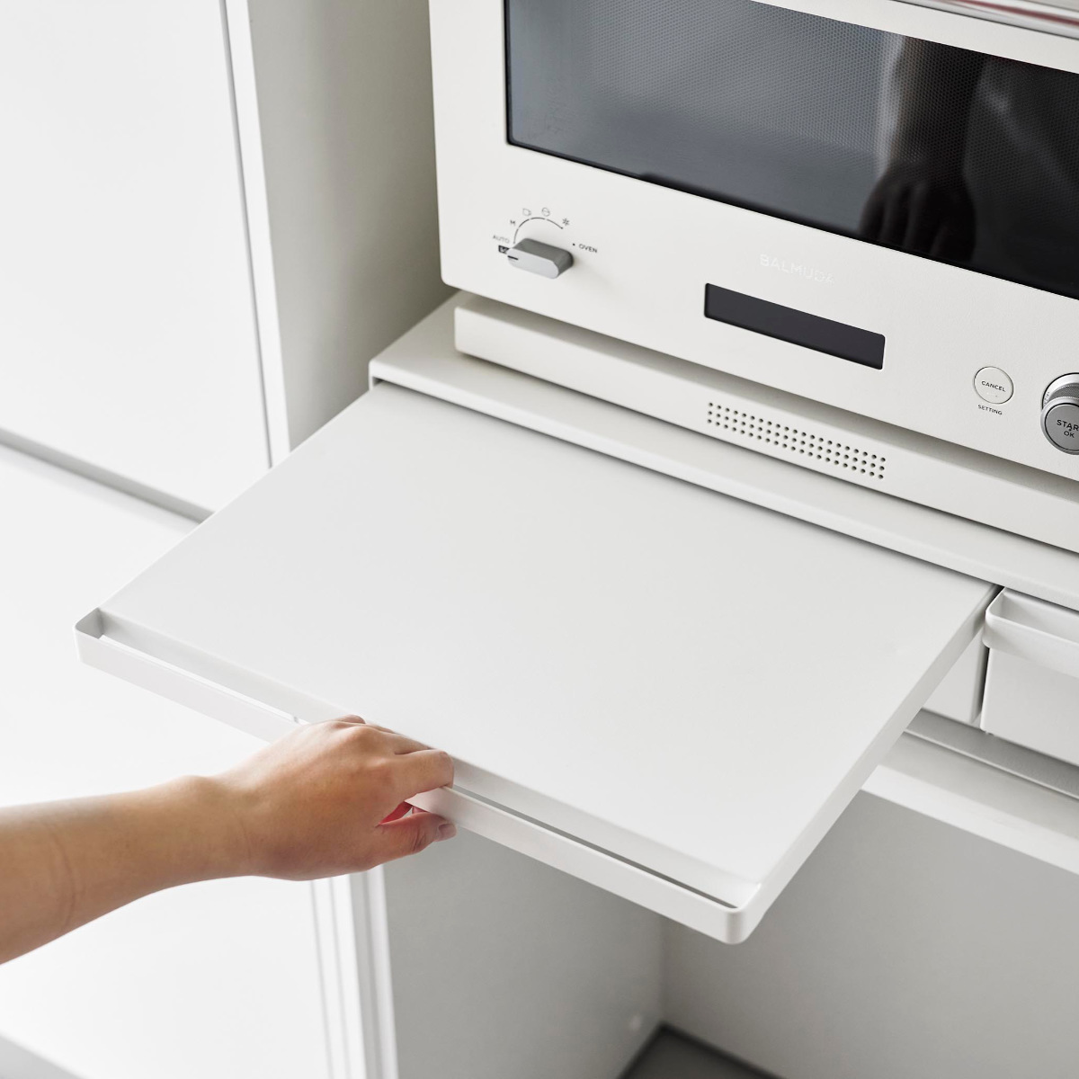 家電下のスペースが便利な作業スペースとして使えるスライドテーブルです。電子レンジ下に設置すれば温めたものの一時置きに使え、炊飯器の下に置けばご飯をよそう時に便利で幅広く活用できます。必要な時に引き出して使えるのでキッチン動線の邪魔にもなりません。