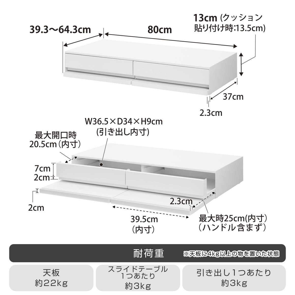 必要な時にだけ引き出せるスライドテーブルは、最大約25cm引き出せて、幅80cmのワイドサイズで広々使えます。