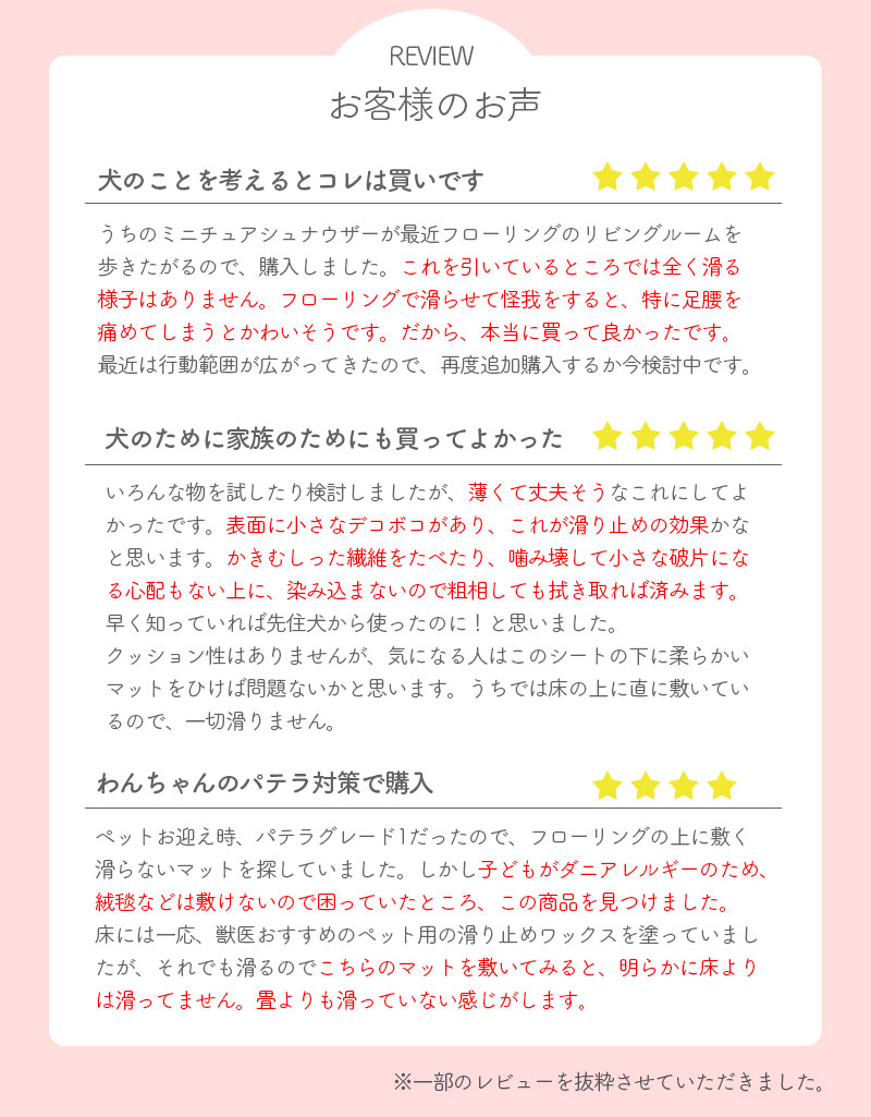 | 商品説明 | ●犬・猫・うさぎ等のペット向けペットマット! ●防滑・消臭機能付き ●ビニール製でお手入れ簡単、丸洗いOK! ●お好きなサイズに簡単にカットできます! ●滑りにく表面加工で、ペットの足腰への負担を軽減します! ●ペットの爪に強い耐久性! ●柄・カラー展開、全7アイテムの品揃え! |