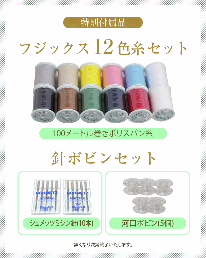 フットコントローラー、、基本押さえ、たち目かがり押さえ、ファスナー押さえ、サテン押さえ、まつりぬい押さえ、ボタンホール押さえ、糸こま押さえ(大・小 各2個)、補助糸立て棒、ボビン4個、針、シームリッパー、ミシンブラシ、ドライバー、オリジナルピンクッション、説明DVD、取扱い説明書