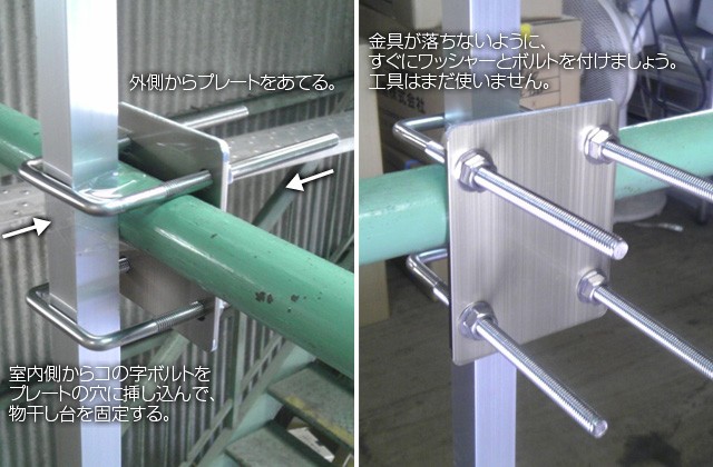 外側からプレートをあてて、室内側からコの字ボルトをプレートの穴に挿しこみます。