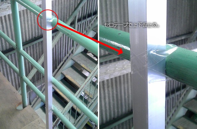 下側も同じ用に金具を付けて、物干し台がガタつかないよう仮締めしたら、セロテープを取ります。