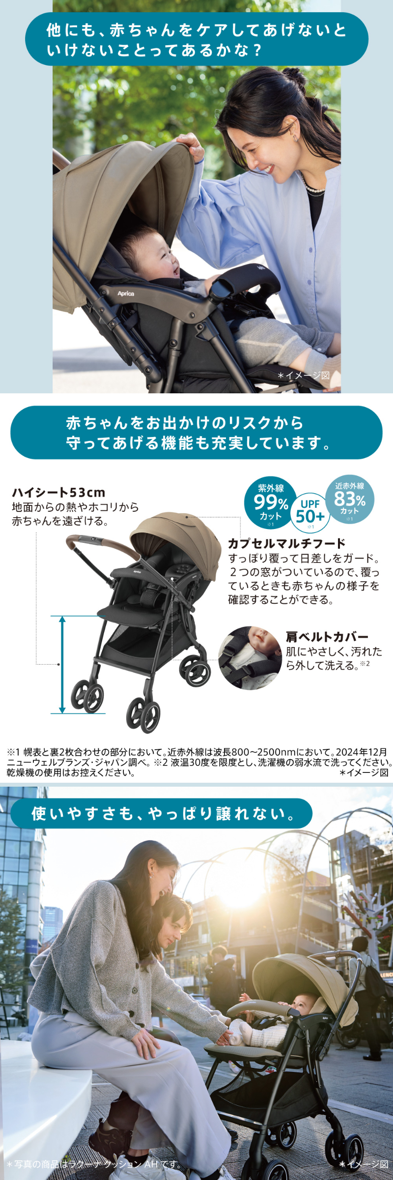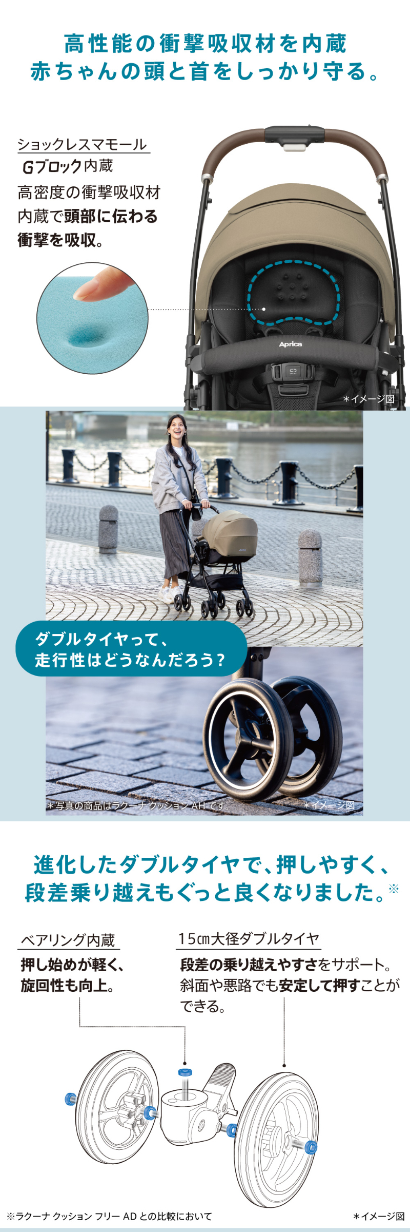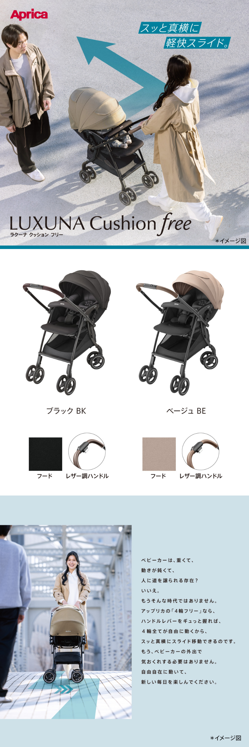 | スッと真横に軽快スライド。 アップリカ ラクーナクッション フリー AE ハンドルレバーを握るだけでスッと真横にスライドできるため,自由自在に動くことができます。 未熟な赤ちゃんを振動から守る仕組みがしっかり備わっているから安心です。 ・オメガクッション ・がっちりフレーム ・やわらかサスペンション 高性能の衝撃吸収材を内蔵したヘッドパッドで赤ちゃんの頭と首をしっかり守ります。 ・ショックレスマモール ・Gブロック内蔵 ・独自シェイプ ダブルタイヤは接地点が多いから安定性が強み。 進化したダブルタイヤは,段差乗り越えも押しやすさもぐっと良くなりました。 ・ベアリング内蔵 ・大径ダブルタイヤ 赤ちゃんが快適に過ごせる機能が詰まったシート構造になっています。 ・フィットリクライニング【特許出願中】 ・メディカル成長マモール【特許】 ・Wサーモメディカルシステム ・ふわふわメッシュ本体シート 赤ちゃんをお出かけのリスクから守ってあげる機能も充実しています。 ・肩ベルトカバー ・カプセルマルチフード ・ハイシート53cm お出かけ時のちょっとした困りごとを,スマートな機能でサポートします。 ・イージーベルト ・ハンドル切り替え両対面 ・ワンタッチ開閉 ・フロントイン・ビッグバスケット ・持てるフロントガード※折りたたみ状態時に限る ・オート4輪 その他機能 ワンタッチオープンガード,平らなベッド,5点式ベルト,レザー調ハンドル 製品仕様 |