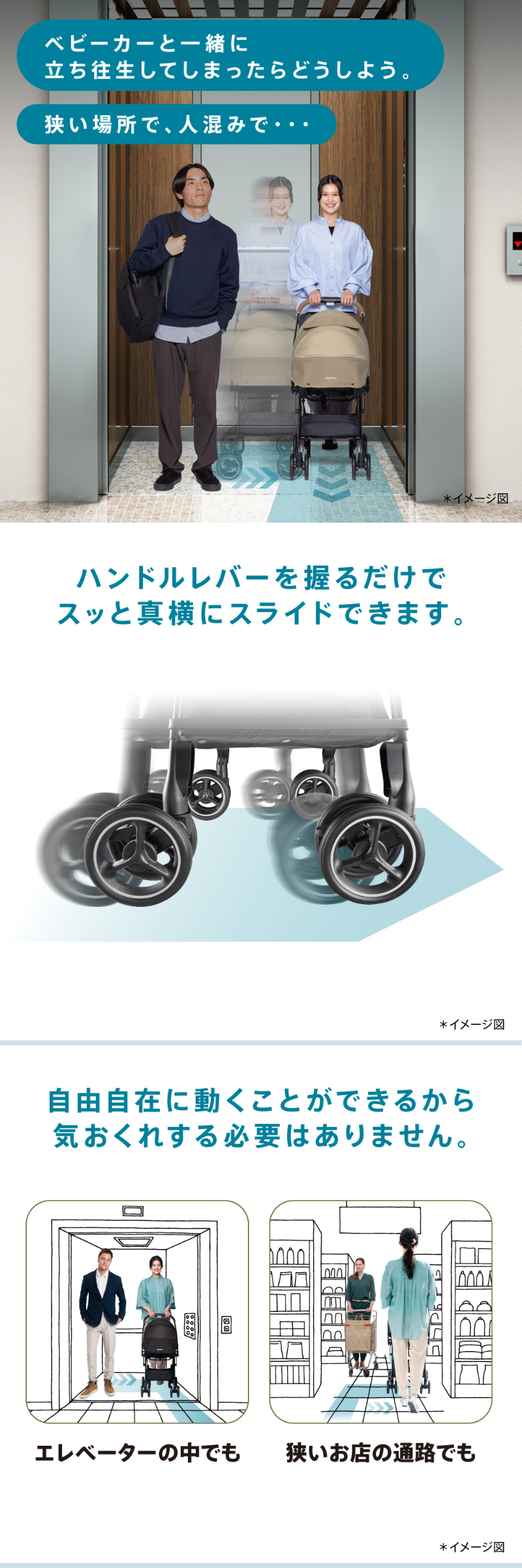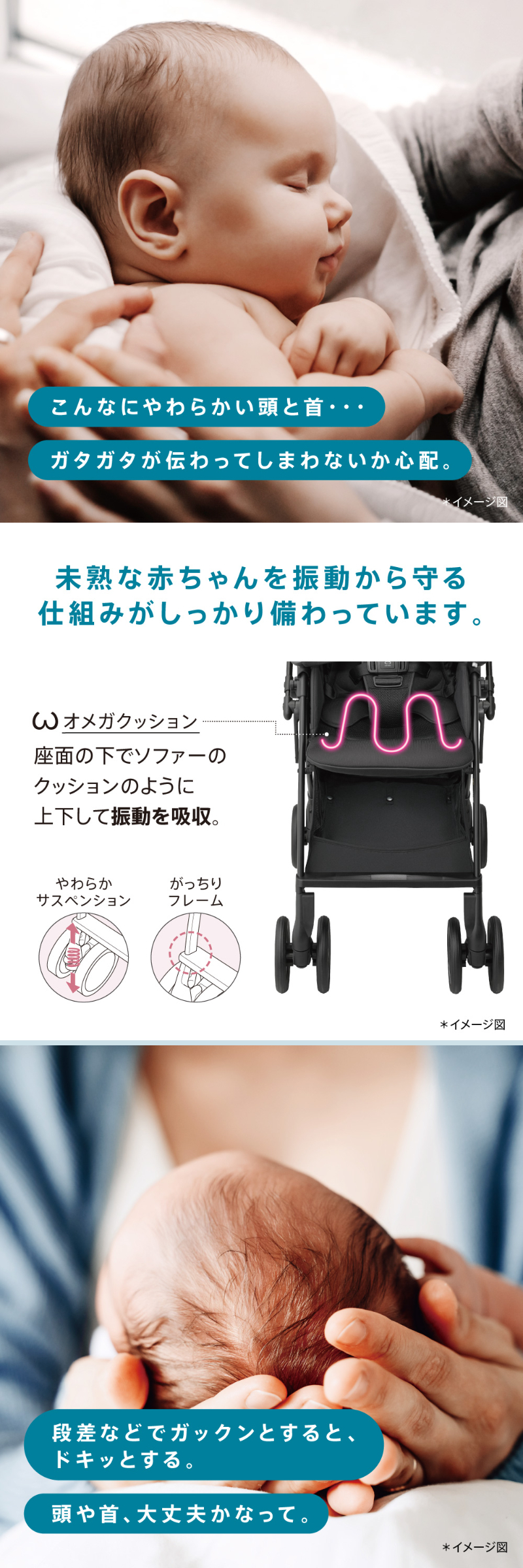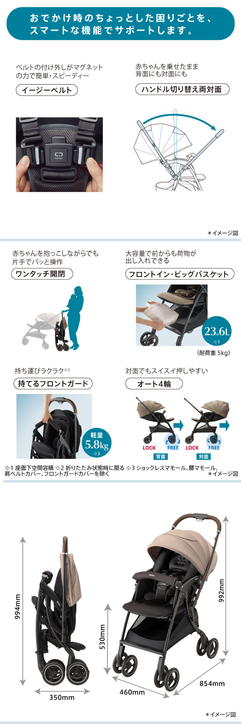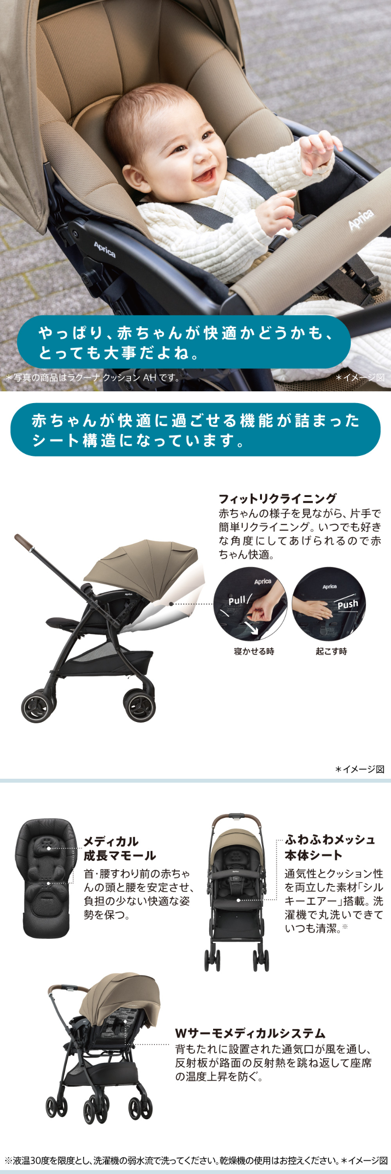 | スッと真横に軽快スライド。 アップリカ ラクーナクッション フリー AE ハンドルレバーを握るだけでスッと真横にスライドできるため,自由自在に動くことができます。 未熟な赤ちゃんを振動から守る仕組みがしっかり備わっているから安心です。 ・オメガクッション ・がっちりフレーム ・やわらかサスペンション 高性能の衝撃吸収材を内蔵したヘッドパッドで赤ちゃんの頭と首をしっかり守ります。 ・ショックレスマモール ・Gブロック内蔵 ・独自シェイプ ダブルタイヤは接地点が多いから安定性が強み。 進化したダブルタイヤは,段差乗り越えも押しやすさもぐっと良くなりました。 ・ベアリング内蔵 ・大径ダブルタイヤ 赤ちゃんが快適に過ごせる機能が詰まったシート構造になっています。 ・フィットリクライニング【特許出願中】 ・メディカル成長マモール【特許】 ・Wサーモメディカルシステム ・ふわふわメッシュ本体シート 赤ちゃんをお出かけのリスクから守ってあげる機能も充実しています。 ・肩ベルトカバー ・カプセルマルチフード ・ハイシート53cm お出かけ時のちょっとした困りごとを,スマートな機能でサポートします。 ・イージーベルト ・ハンドル切り替え両対面 ・ワンタッチ開閉 ・フロントイン・ビッグバスケット ・持てるフロントガード※折りたたみ状態時に限る ・オート4輪 その他機能 ワンタッチオープンガード,平らなベッド,5点式ベルト,レザー調ハンドル 製品仕様 |