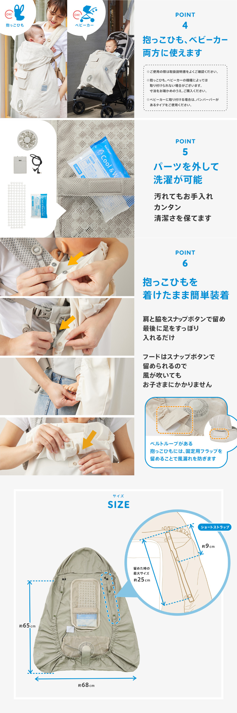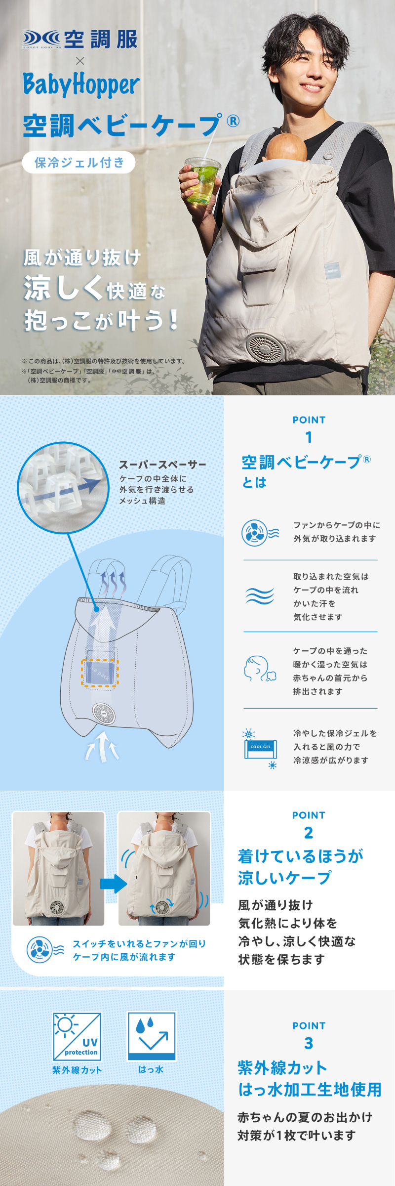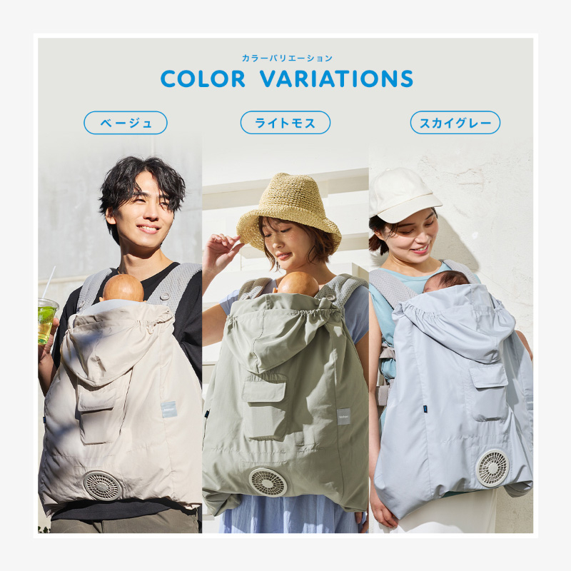 | 赤ちゃんの暑さ対策に! Baby Hopper(ベビーホッパー) 空調ベビーケープ(保冷ジェル付き) ベビーケープに付いた小型ファンで、ケープの中に外気を取り入れます。 体の表面に大量の風を流すことにより, かいた汗を気化させます。 常に涼しく快適な状態を保つ、着けているほうが涼しいケープです。 メッシュ構造の「スーパースペーサー」により、ケープの中全体に外気を行き渡らせます。 ※スーパースペーサーは株式会社セフト研究所により開発された技術です。 紫外線カット、はっ水加工生地を使用で、赤ちゃんの夏のお出かけ対策が一枚で叶います。 抱っこ紐、ベビーカー両方に使えます。 ※ご使用の際は取扱説明書をよくご確認ください。 ※抱っこひも、ベビーカーの機種によっては取り付けられない場合がございます。寸法をお確かめのうえ、ご購入ください。 ※ベビーカーに取り付ける場合は、バンパーバーがあるタイプをご使用ください。 抱っこ紐を着けたまま、簡単に装着することができます。 フードはスナップボタンで留められるため、風が吹いてもお子様にはかかりません。 パーツは洗濯可能!汚れても簡単にお手入れが可能で、清潔を保ちながら使用できます。 【仕組み】 ファンからケープの中に外気が取り込まれます。取り込まれた空気はケープの中を流れ、その過程でかいた汗を気化させます。 ケープの中を通った、暖かく湿った空気は赤ちゃんの首元から排出されます。 屋外などエアコンの使用できない環境でも、快適にすごしていただけるようになります。 風力は強弱を選択できます。 ・単三電池4本使用(別売り) 強:約8.5時間(最大風力17.8L) 弱:約44時間(最大風力9.9L) ・保冷ジェル付き ・エルゴベビー・ベビーキャリア対応 ※ 電池ボックスに電池を入れておきます。(+、ーに注意してください) ※ 保冷ジェルは冷凍庫で3時間、冷凍庫内に水平に置いて冷やしてください。(8時間を越えて冷凍するとかたくなることがあります。室温でやわらかくなってから使用してください)冷やした保冷ジェルはメッシュポケット内、スペーサーの上に重ねてセットしてください。 |