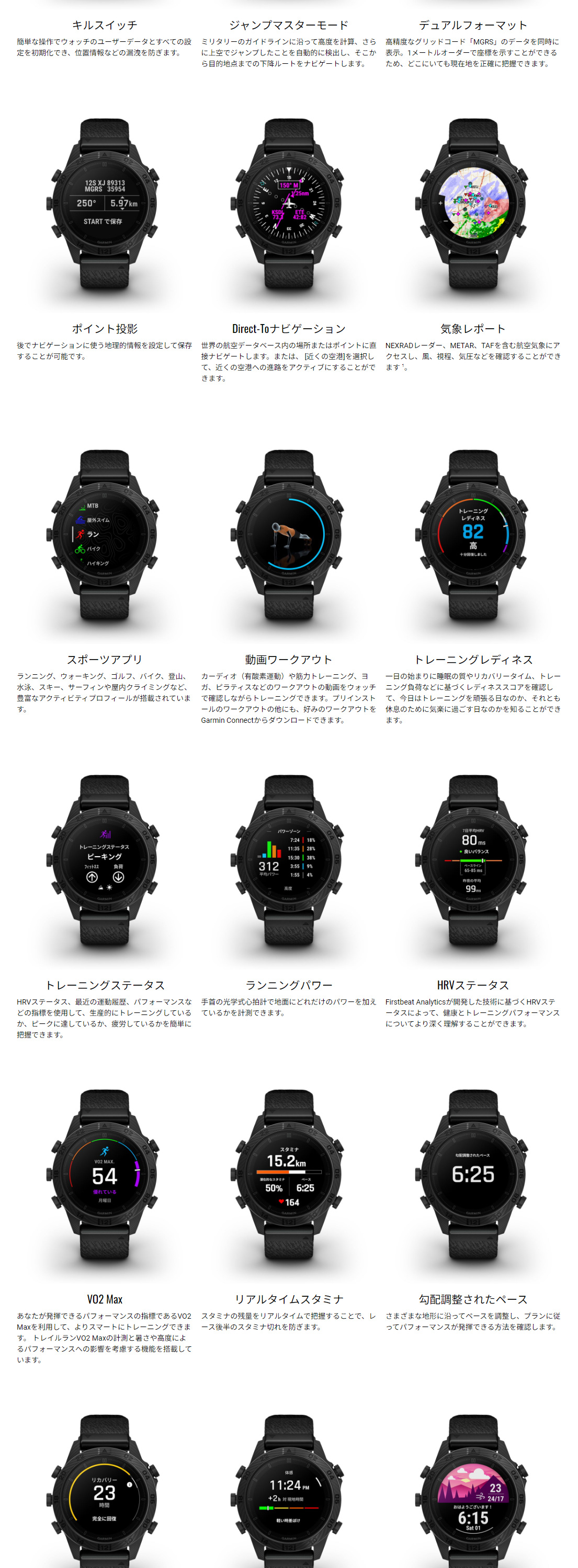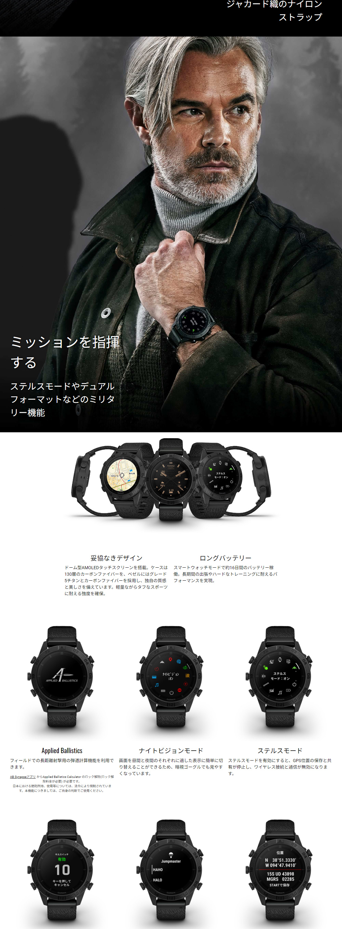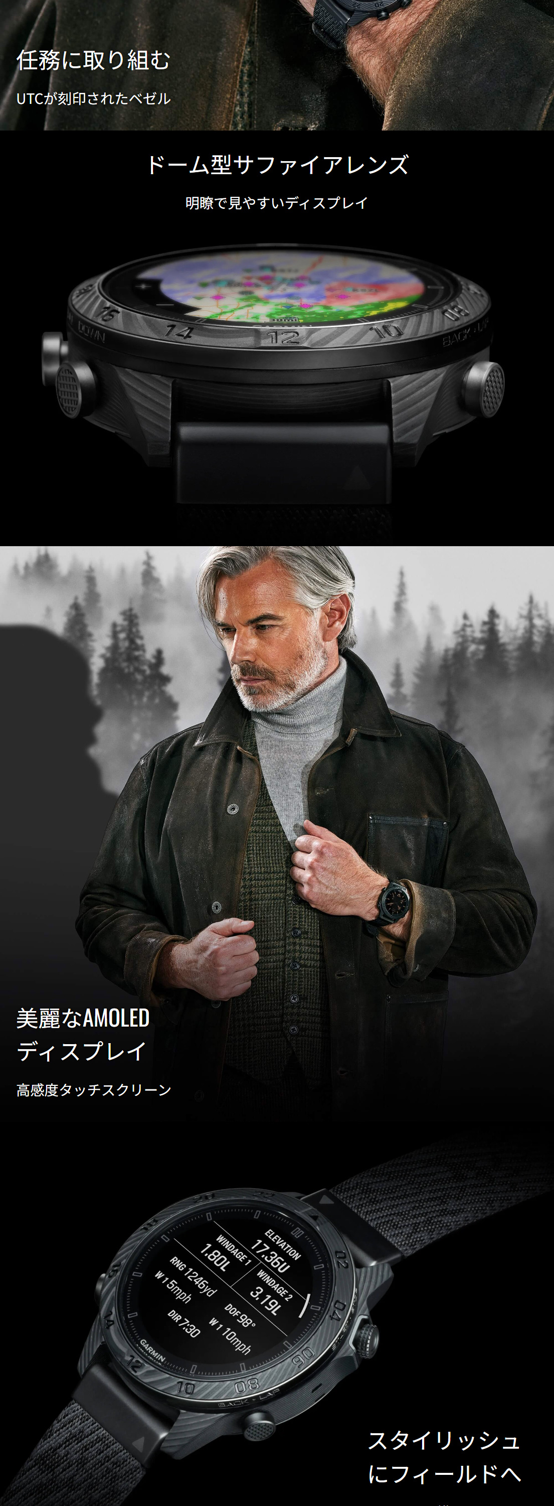 タクティカル機能と航空機能を備えたGPSウォッチ。ベゼルには、手作業で印字されたUTC/協定世界時をデザイン。世界のどこにいても、タイムゾーンと時差を確認することができます。DLCコーティングを施したチタン製ベゼルスペーサーも装備し、ムーブメントを衝撃から守ります。ディスプレイにはナイトビジョンモード搭載。ストラップは南仏の職人によるジャカード織のナイロンバンドを採用し、手首に心地良くフィットします。ジャンプマスター、ステルスモード、ウェイポイント、デュアルポジションフォーマット、プリロードされたタクティカルアクティビティなど、タクティカル向けの特殊機能が充実。長距離射撃をサポートする弾道計算機(有料)も搭載しています。GNSSマルチバンドとSatIQ技術により、あらゆる環境で最高の測位精度を実現。プリロードされた世界地図TopoActiveは、周囲状況、標高プロファイル、屋外ポイントなどのナビゲーション情報を提供します。航空機能は、Direct toナビゲーションやNEXRAD天気レーダーなど高度な機能を備えています。