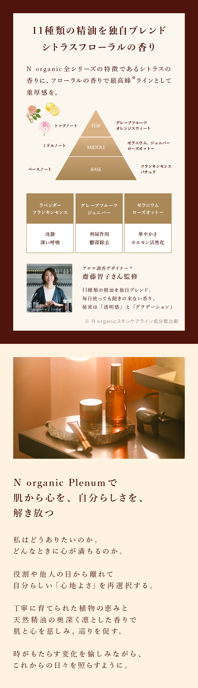 水 グリセリン プロパンジオール スクワラン トリエチルヘキサノイン マカデミアナッツ脂肪酸フィトステリル ジグリセリン ベヘニルアルコール ジメチコン パルミチン酸セチル ペンチレングリコール シクロペンタシロキサン トリポリヒドロキシステアリン酸ジペンタエリスリチル ラウロイルグルタミン酸ジ(フィトステリル/オクチルドデシル) 水添レシチン (アクリル酸ヒドロキシエチル/アクリロイルジメチルタウリンNa)コポリマー イソステアリン酸デキストリン BG エチルヘキシルグリセリン ポリソルベート60 キサンタンガム ヒマワリ種子油 ダマスクバラ花油 ラベンダー油 グレープフルーツ果皮油 セイヨウネズ果実 油パルマローザ油 ベルガモット果実油 パチョリ油 ニュウコウジュ油 オレンジ果皮油 ニオイテンジクアオイ油 クスノキ木油 ザクロ果実エキス カラメル、トコフェロール リン酸アスコルビルMg ホホバ種子油 エラグ酸 ザクロ種子油 加水分解ヒアルロン酸 バクチオール マロン酸ジエチルヘキシルシリンギリデン 糖脂質 アルカナ根エキス ジラウラミドグルタミドリシンNa トリ(カプリル酸/カプリン酸)グリセリル トウキンセンカ花エキス カニナバラ果実エキス 加水分解コラーゲン アカツメクサ花エキス セージ葉エキス カミツレ花エキス カラスムギ穀粒エキス フユボダイジュ花エキス ダイズ種子エキス ビルベリー葉エキス アーチチョーク葉エキス