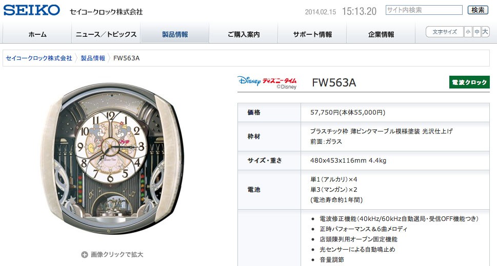 | 機能 | ・電波修正機能(40kHz/60kHz自動選局・受信OFF機能つき) ・正時パフォーマンス&6曲メロディ ・店頭陳列用オープン固定機能 ・光センサーによる自動鳴止め ・音量調節 ・報時モニター機能 ・LEDライト点滅(12ヶ所) ・一方向回転飾り(クリスタルガラスエレメント:オーロラ仕上げ4ヶ) ・飾り(クリスタルガラスエレメント:青4ヶ/薄青3ヶ/薄ピンク3ヶ/赤7ヶ) ・電池切れ予告機能(秒針停止) ・ステップセコンド ・おやすみ秒針(光センサーによる自動秒針停止機能) |