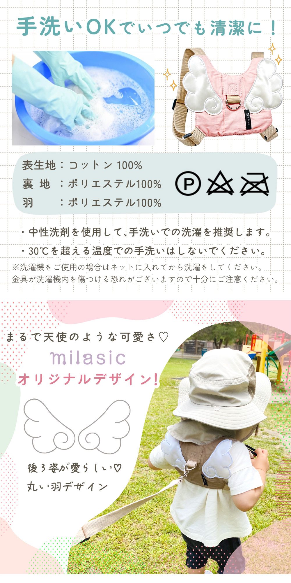 子供用に設計されたナビキッズハーネスは、軽量かつソフトな素材で幼児の身体にやさしくフィット。迷子防止紐は取り外し可能で、リュック単体としても使用可能。調節ベルト付きで1歳・2歳・3歳の成長に合わせて長く使用できます。
