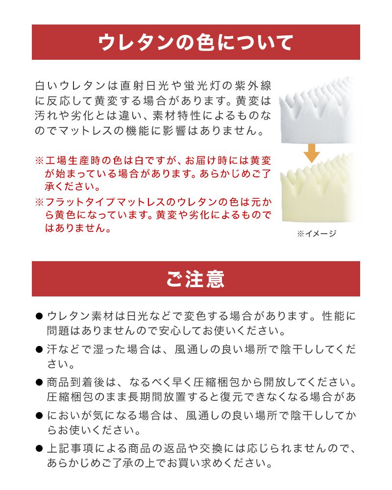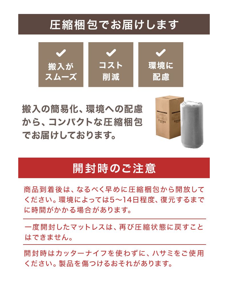 ・圧縮梱包されたままの状態で長期間保管した場合、マットレスが復元できなくなってしまいます。商品到着後、すぐ圧縮から開放をして頂くようにお願いいたします。