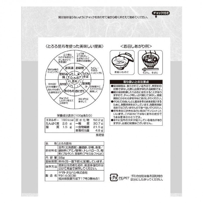 | たっぷり入ったお徳用とろろ昆布です。裏面にはとろろ昆布を使った美味しい提案が載っています。 |