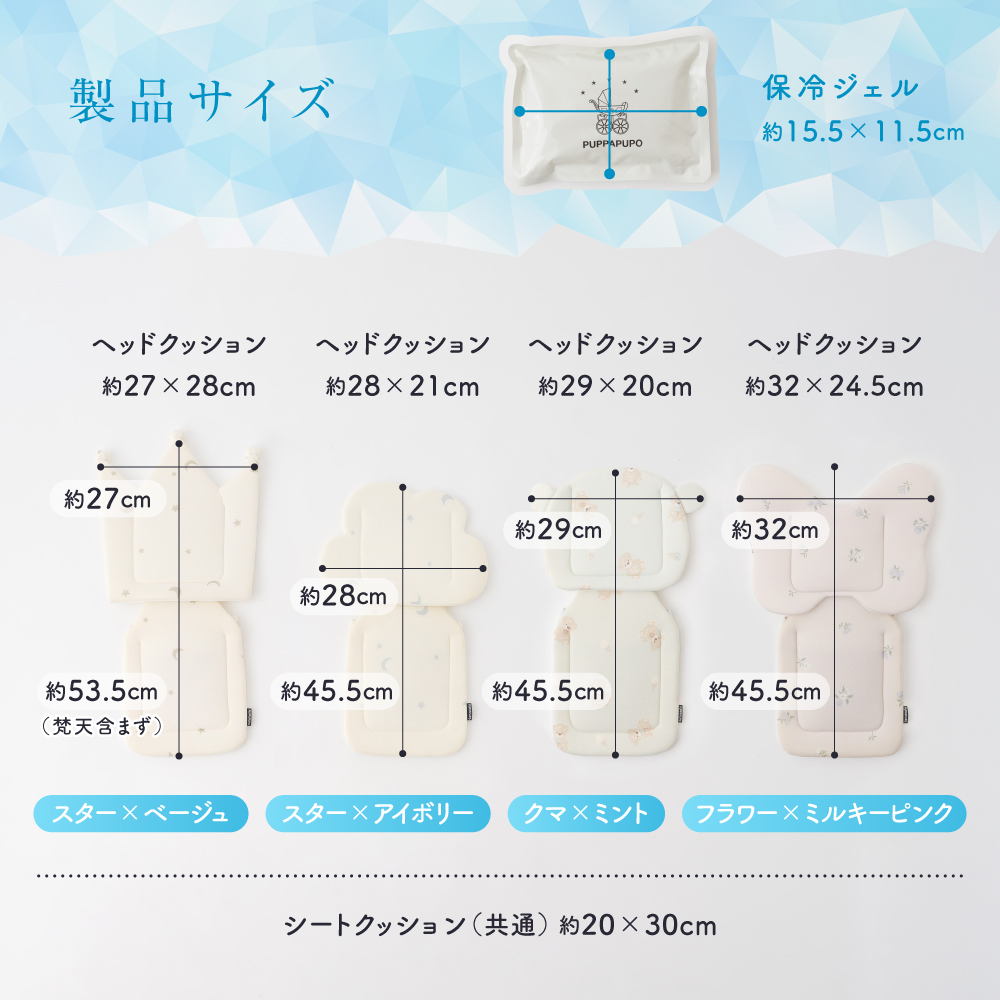 | サイズ | スター×ベージュ(クラウン):約27×53.5cm ボンテン含まず (ヘッドクッション約27×28cm 、シートクッション約20×30cm) スター×アイボリー(クラウド):約28×45.5cm (ヘッドクッション約28×21cm 、シートクッション約20×30cm) フラワー×ミルキーピンク(リボン):約32×45.5.cm (ヘッドクッション約32×24.5cm 、シートクッション約20×30cm) クマ×ミント(クマ):約29×45.5cm (ヘッドクッション約29×20cm 、シートクッション約20×30cm) 保冷ジェル:15.5×11.5cm |