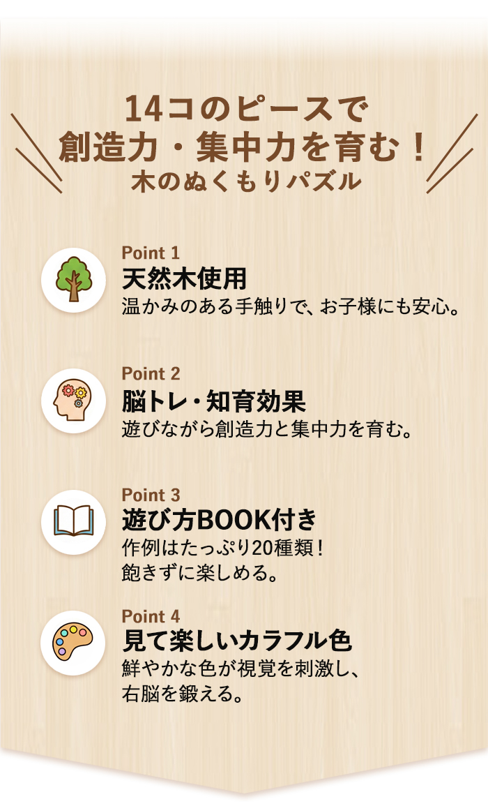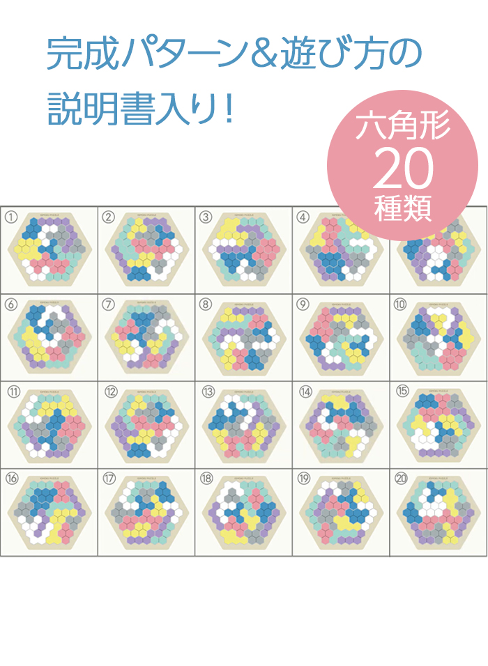 | 商品特徴 | ■お子様からお年寄りまで、頭の体操になる優れたパズル! ・ピースをフレームにはめ込んでパズルを完成! ・完成パターンの組合せ方は20種類。 ・優しい手触りの天然木製。 ・ピースを組合せていろいろな形を作っても楽しい! ・完成パターン&遊び方の説明書入り。 |