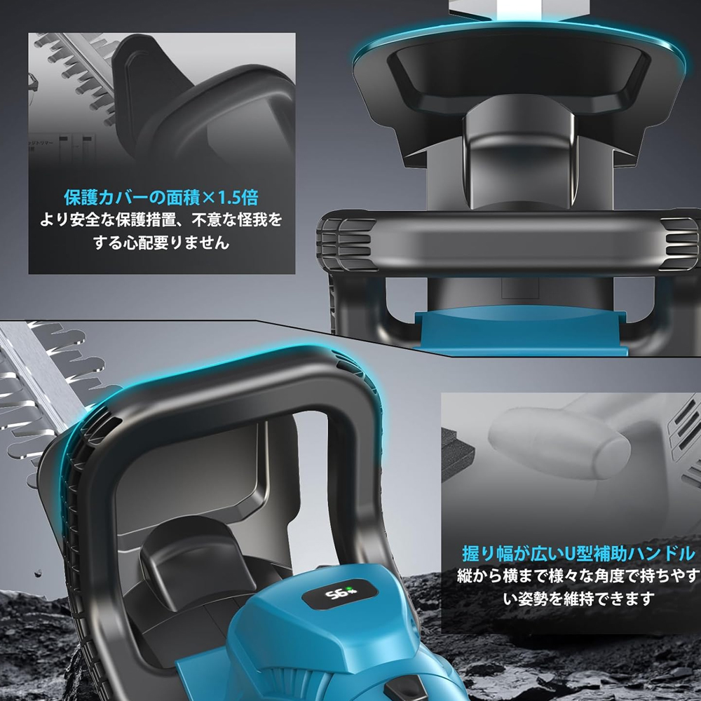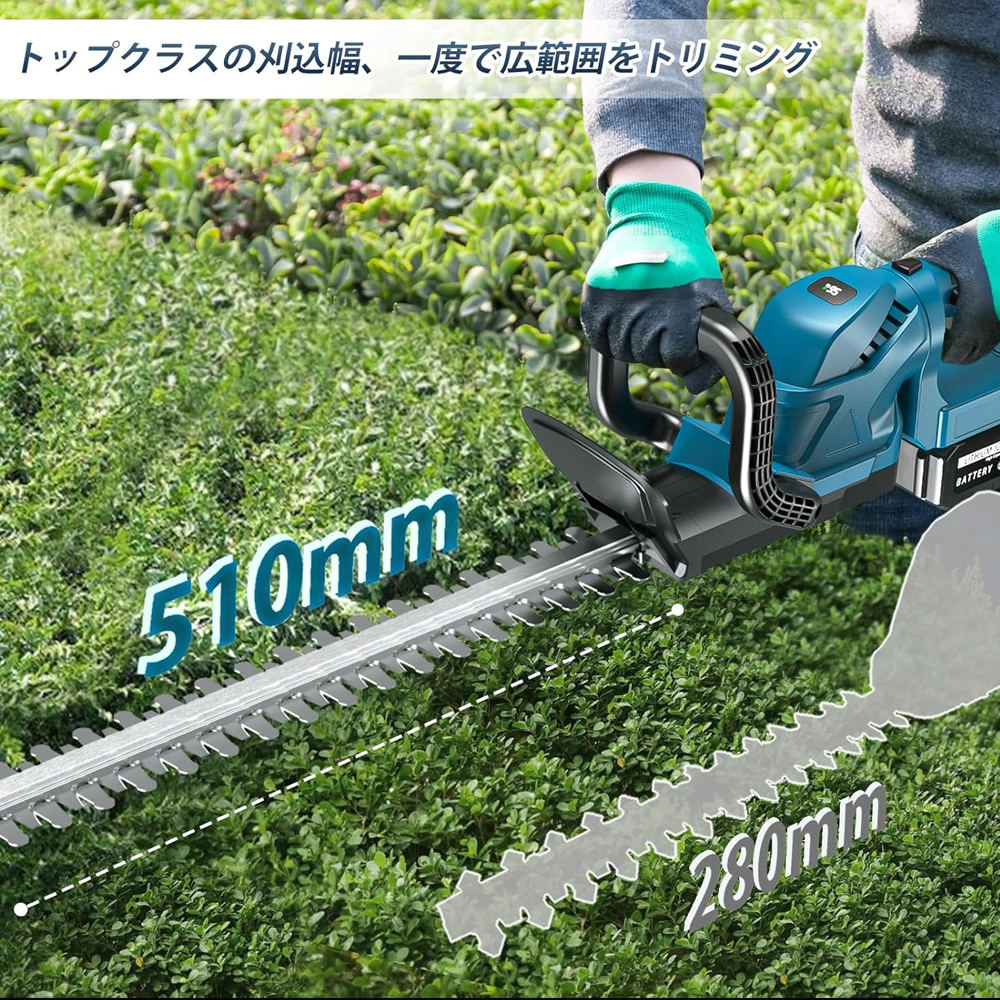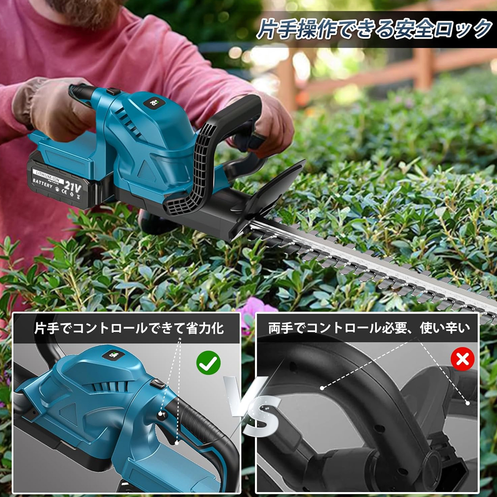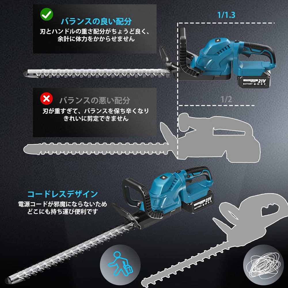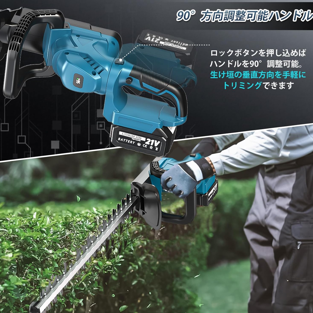 大容量リチウムバッテリー2個を付属する電動ヘッジトリマー。使用場所を選ばず、フル充電されたバッテリー1個分の作業時間は約1時間ほど、2個交代で2時間連続作業可能。マキタ18Vバッテリー(BL1830、BL1840、BL1850、BL1860B)と互換性があります