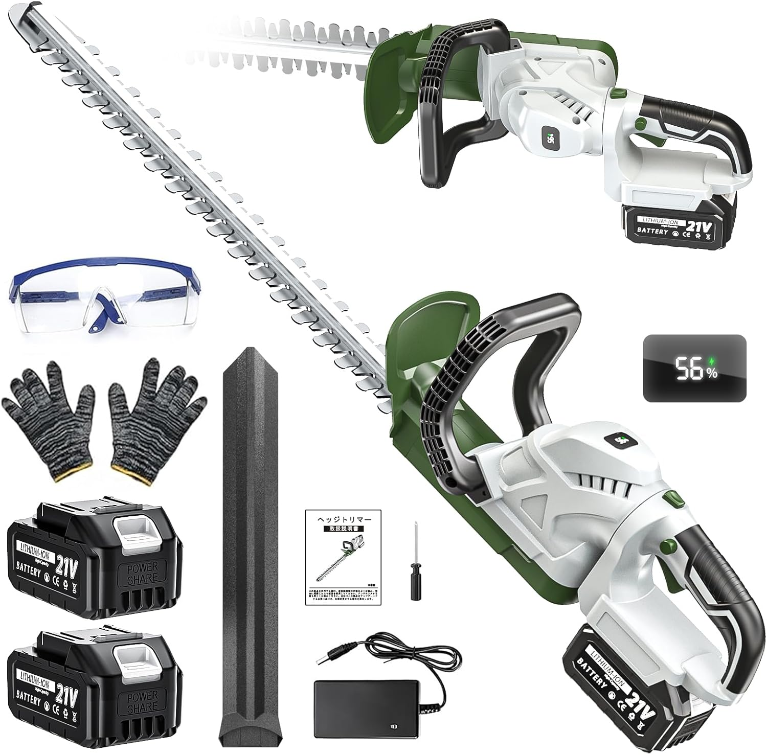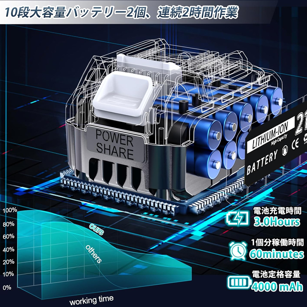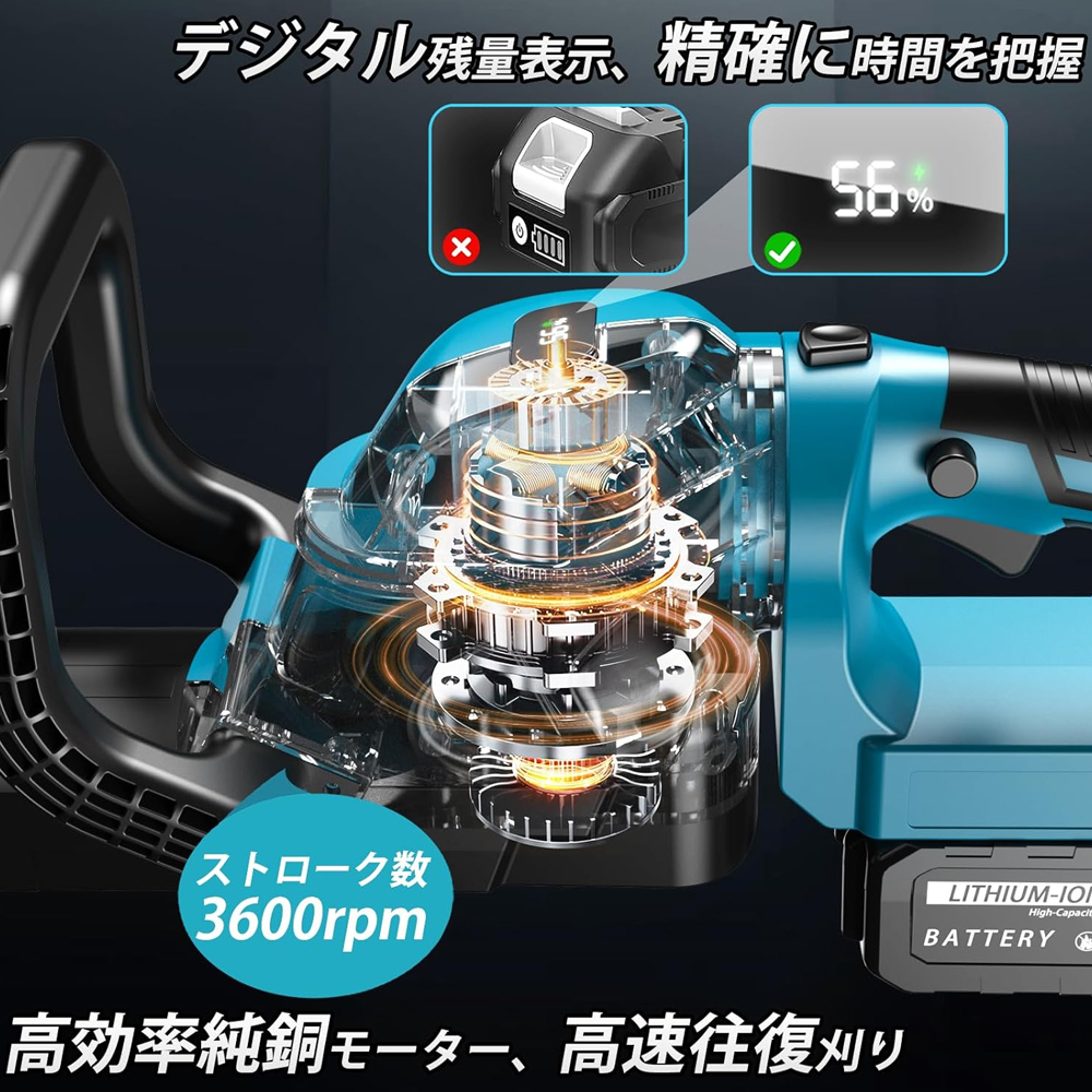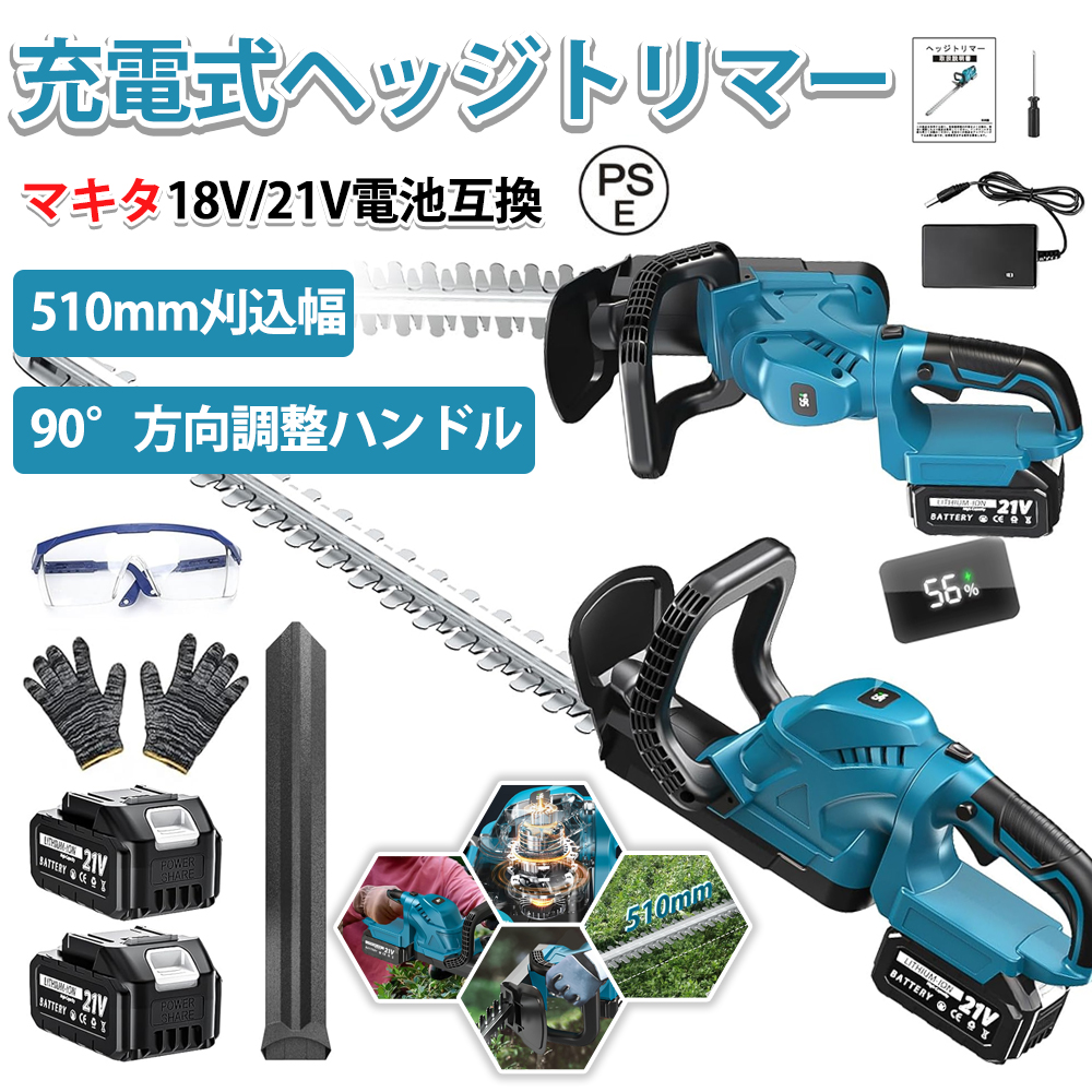大容量リチウムバッテリー2個を付属する電動ヘッジトリマー。使用場所を選ばず、フル充電されたバッテリー1個分の作業時間は約1時間ほど、2個交代で2時間連続作業可能。マキタ18Vバッテリー(BL1830、BL1840、BL1850、BL1860B)と互換性があります