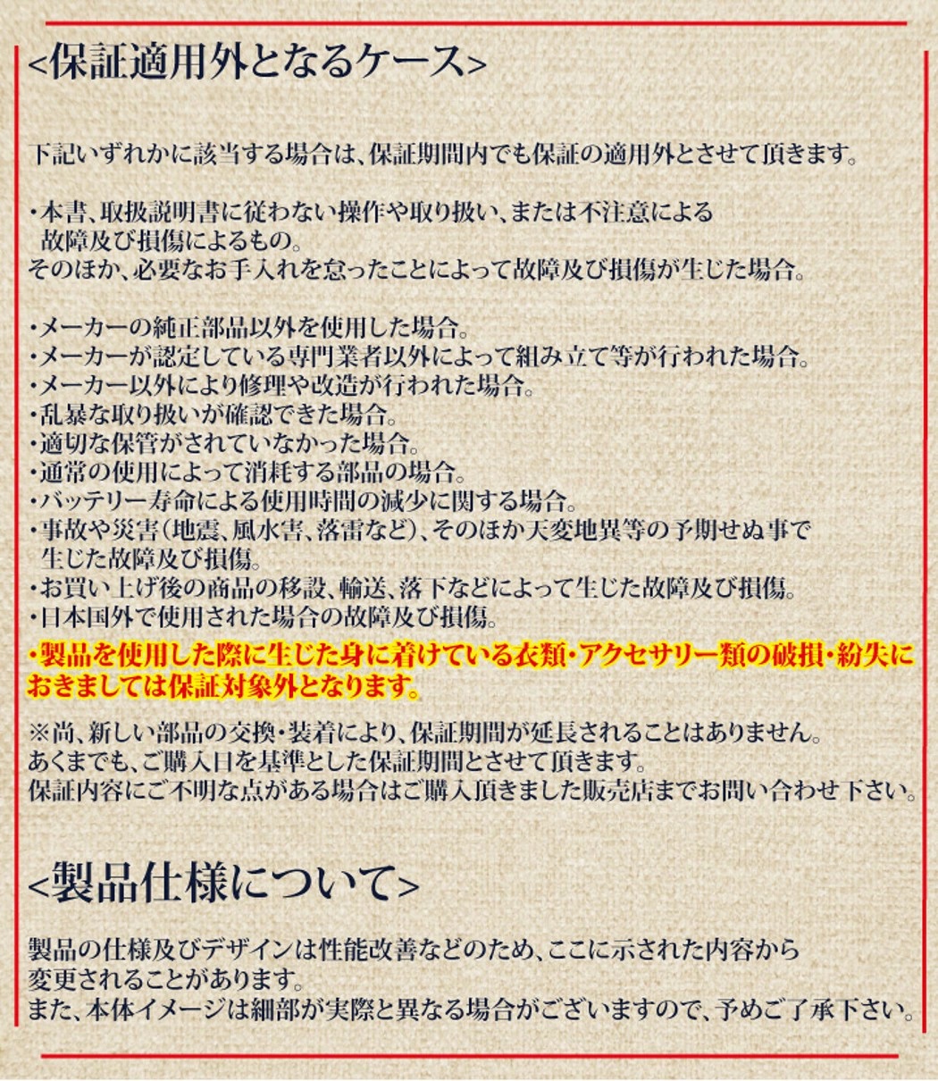 ・商品到着後からの保証となりますので、すぐにご使用にならない場合でも、到着後は速やかに商品の動作のご確認をお願いいたします。