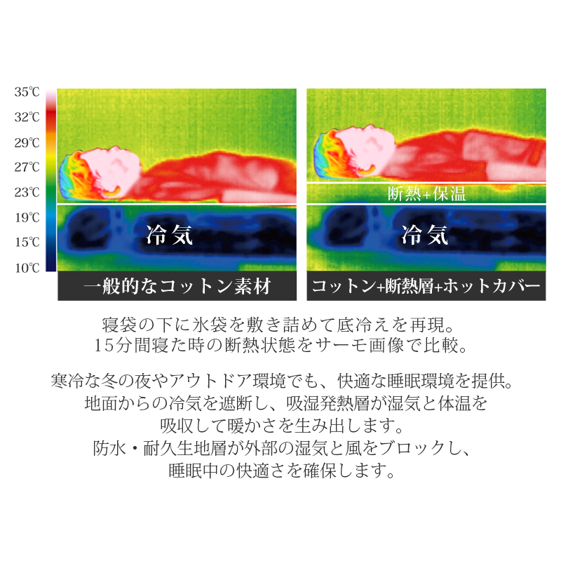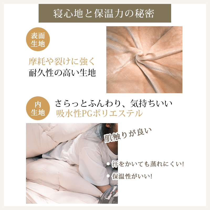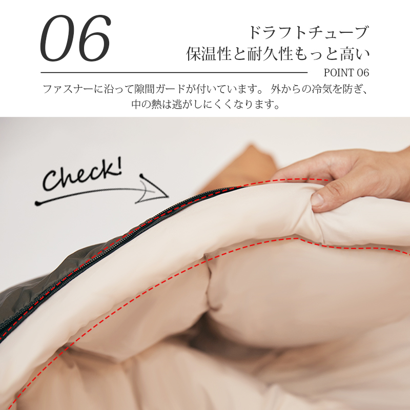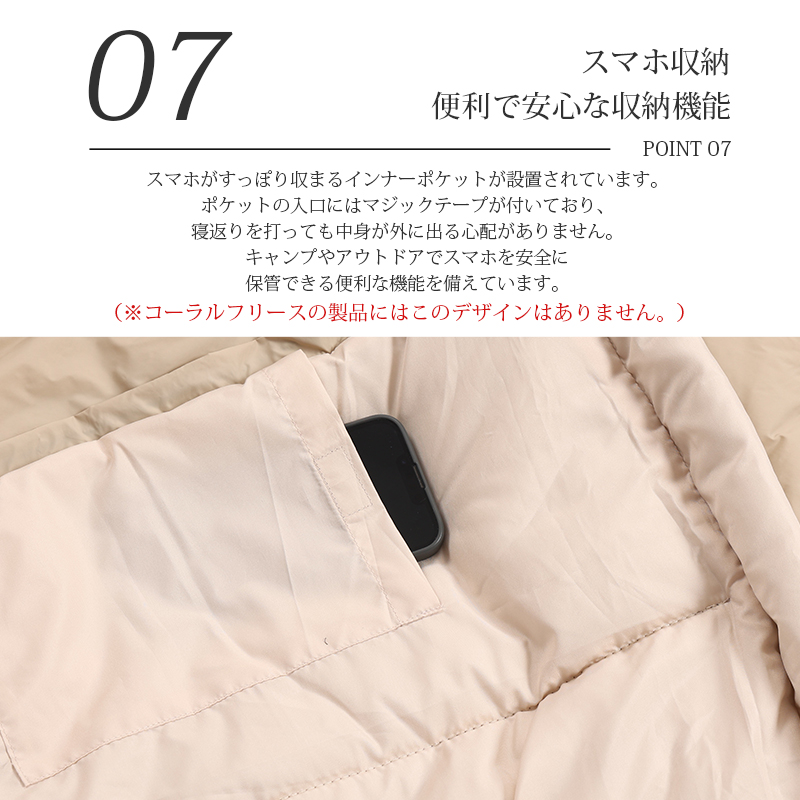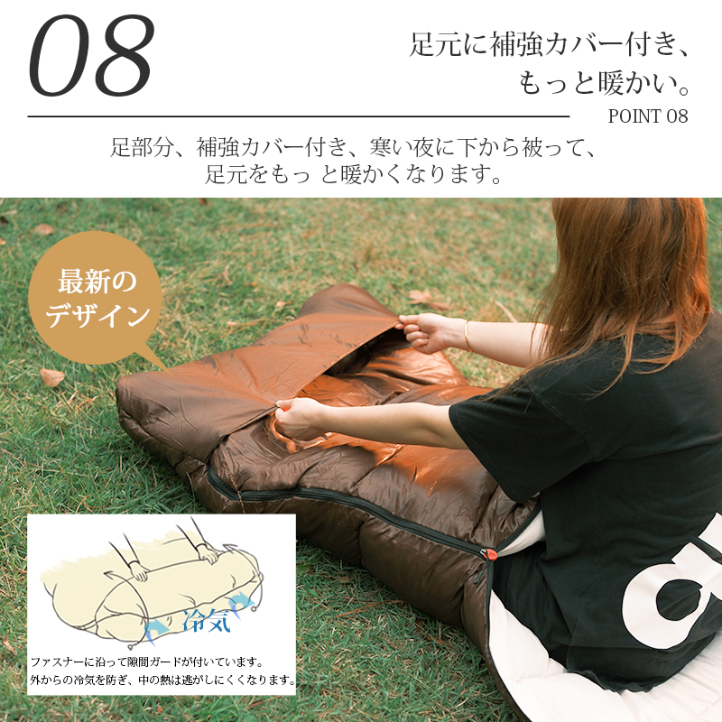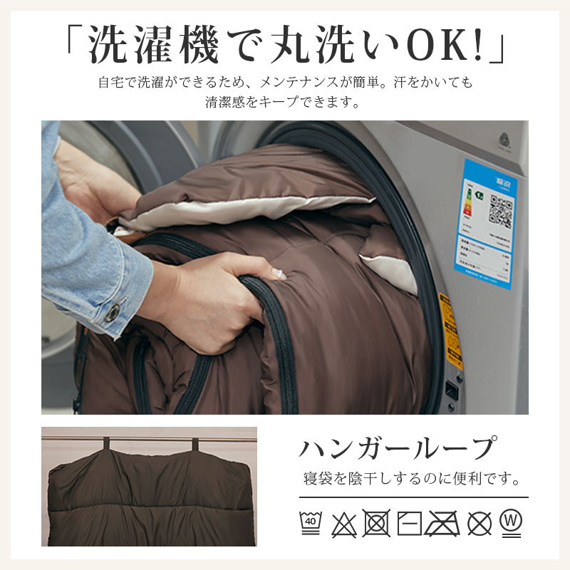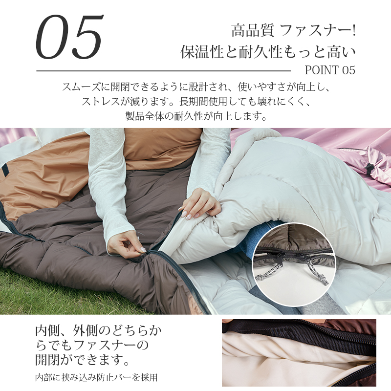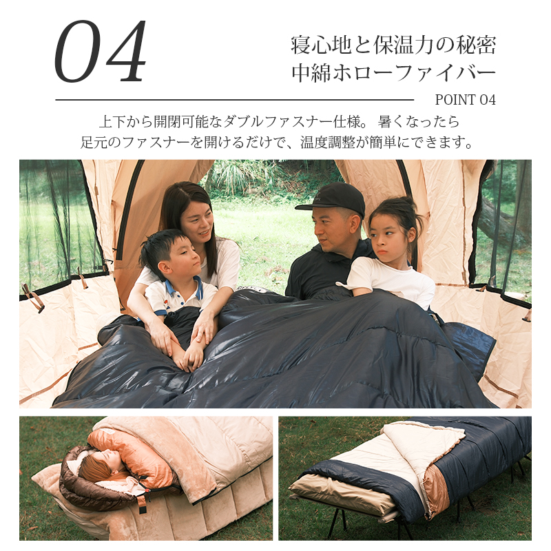 無制限のレイアウトができます、ご家族5人で寝袋三つのレイアウトでも使用が楽々◎ 【POINT.5 持ち運び】 中綿を3Dファイバー製中空化学繊維を採用、保温性優れた上に軽量でコンパクト。 【POINT.6 内部多機能ポケット】 内部多機能ポケットには携帯や貴重品などを入れていただけます。 【POINT.7 余裕のあるサイズ設計】 展開時:幅100cm 寝袋として余裕のあるサイズ設計、幅が広いので寝返りしやすい。 【POINT.8 両面ファスナー採用】 両面ファスナーを採用し、外部も同じく、内部からでも簡単に開閉できます。 【POINT.9 丸洗いOK】 中綿は3Dファイバー製中空化学繊維使用している、型崩れしにくく、洗濯しても伸び縮みしにくい繊維です。 【POINT.10 使用方法多様】 「掛け」「敷き」を分離できる、布団のようにご使用いただくことも出来ます。 【POINT.11 足カバー設計】 唯一足カバー付きの寝袋 【カラーバリエーション】 ベージュ×ブラウン、ベージュ×ネイビー、ベージュ×ブラック 【よくあるご質問】 ・冬には使えませんか? | ||