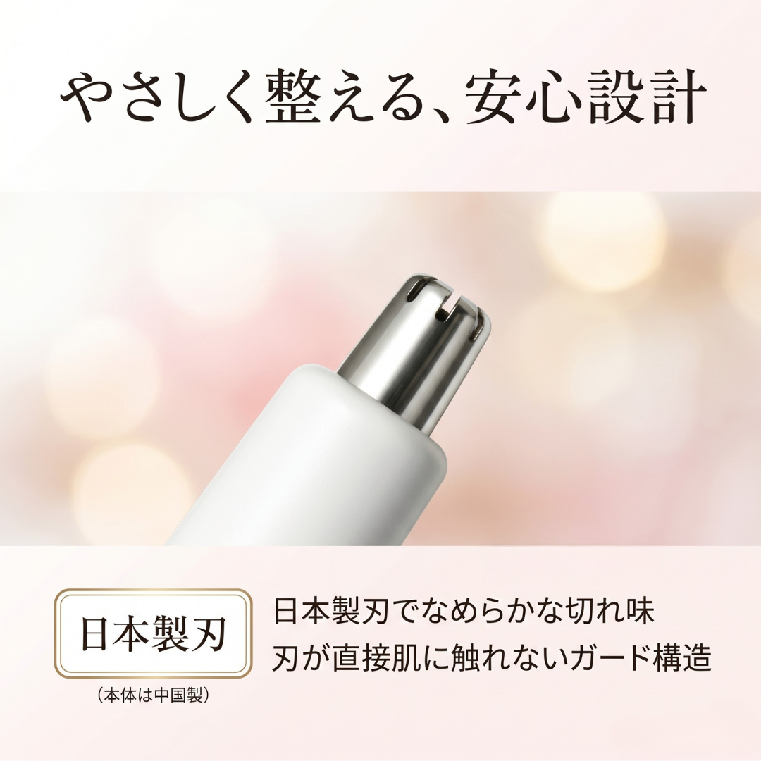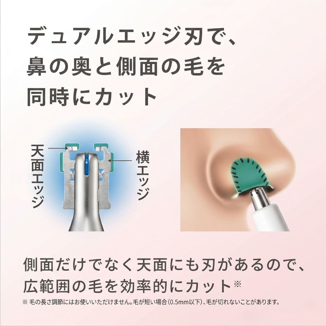 ・日本製のデュアルエッジ刃を搭載し、鼻の奥や側面の毛を効率よくカットしやすい仕様です。