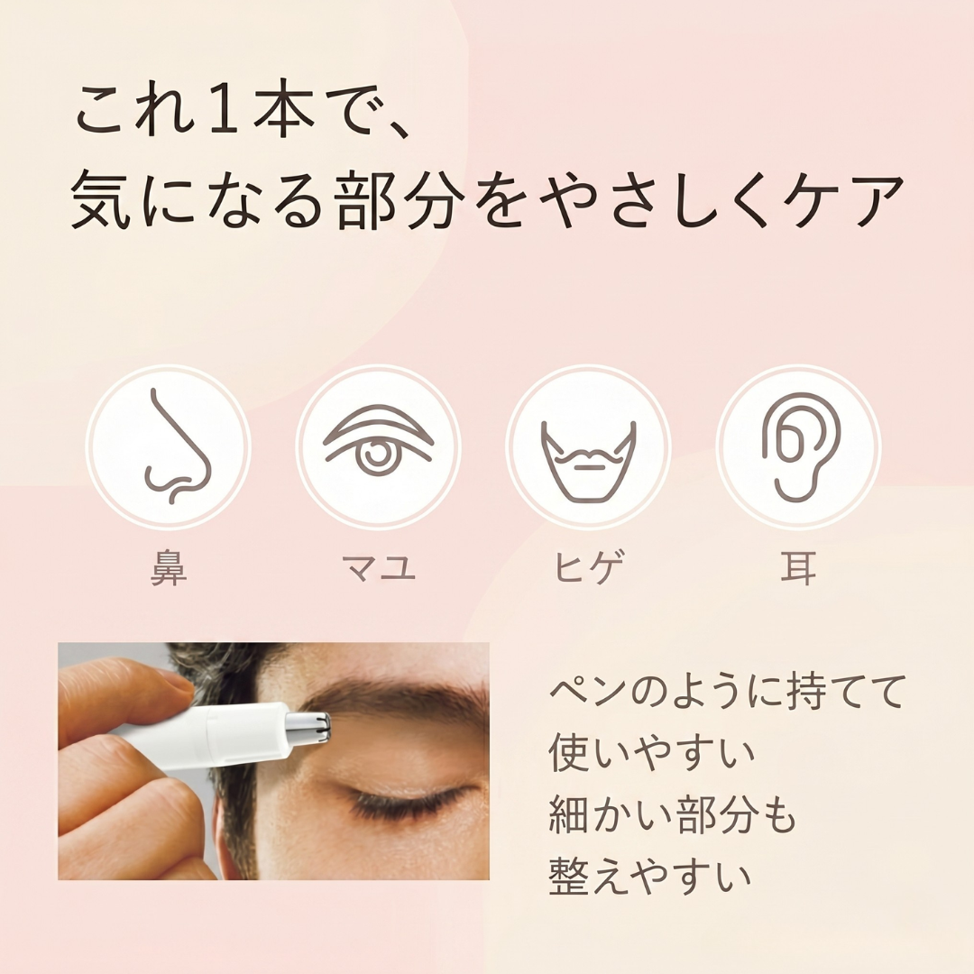 ・鼻毛だけでなく、眉、ヒゲ、耳まわりなど細かな部分の身だしなみケアにも使えます。