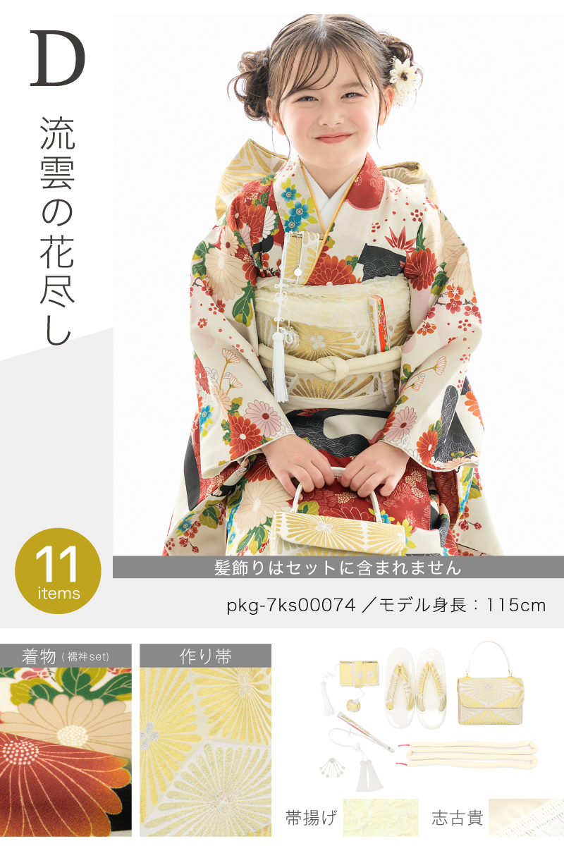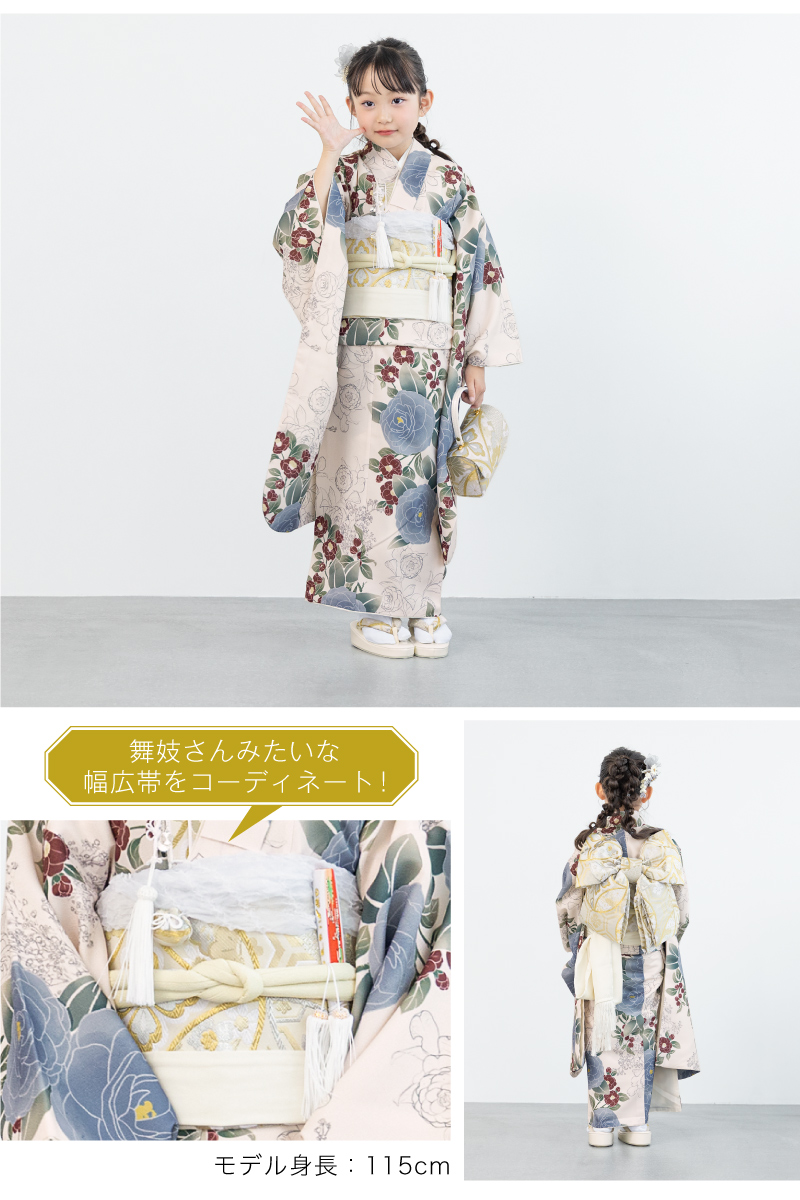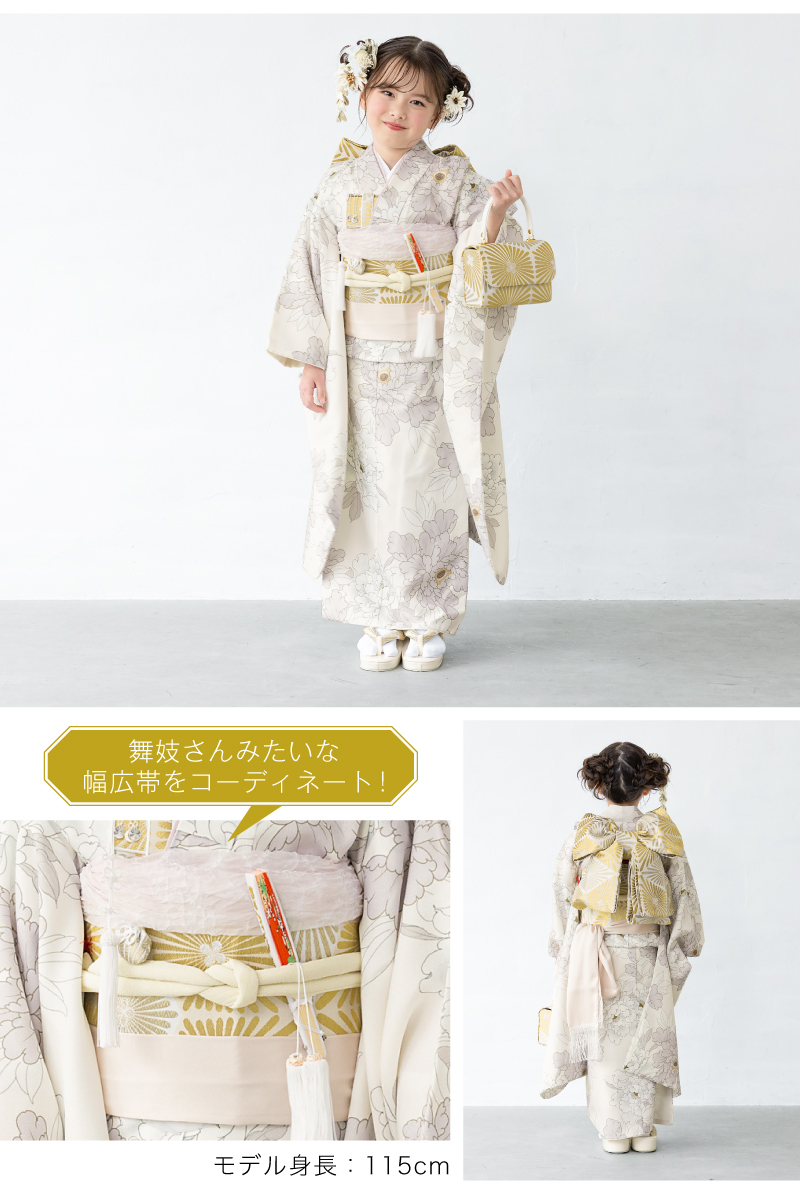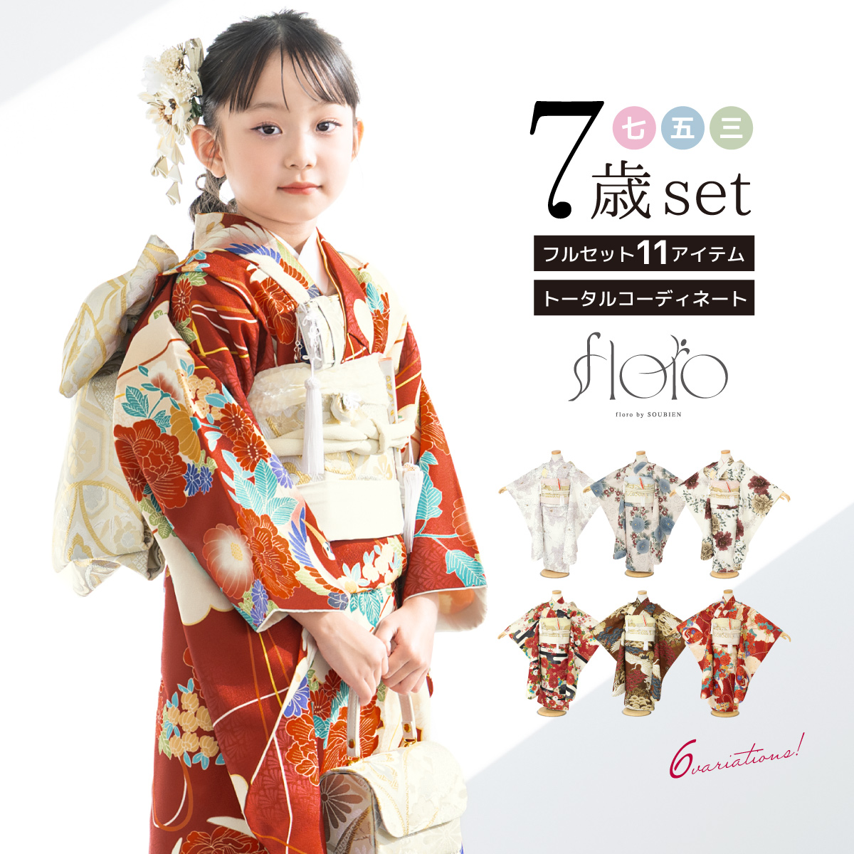 SOUBIENのプライベートブランド『floro by SOUBIEN』(フローロ)から7歳の女の子にお似合いな着物セットです。セット内容は【着物・襦袢・作り帯・はこせこ(びら簪付)・まるぐけ・帯揚げ・しごき・扇子・草履・バッグ】の豪華な11点です。着物は花々が映えるモダンなデザインです。帯は、予め形成された作り帯ですので、着付けの知識がなくても簡単に結んであげられます。