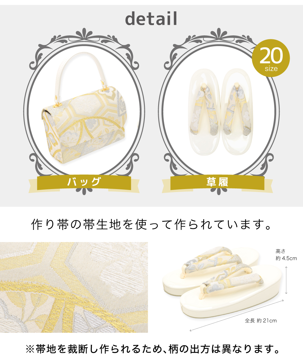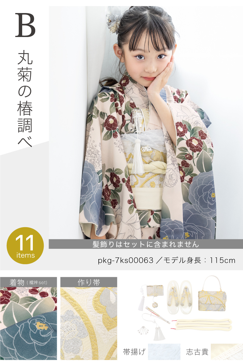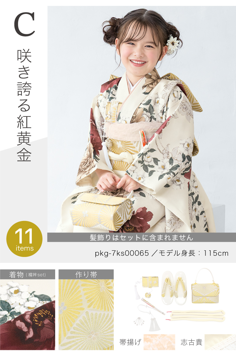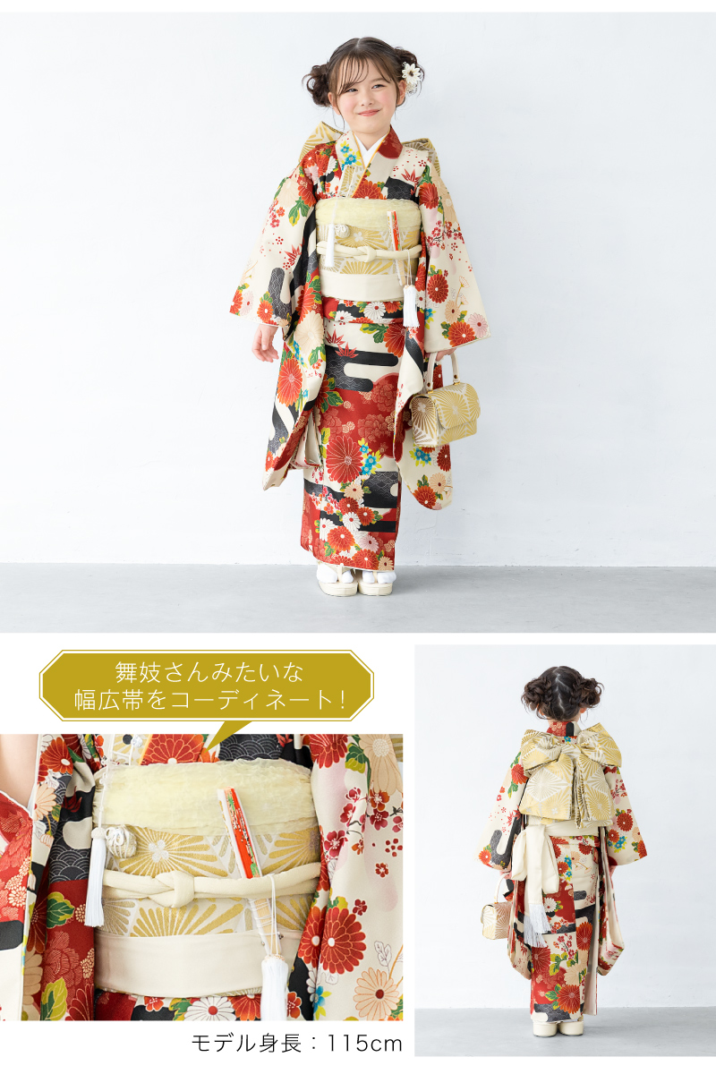 SOUBIENのプライベートブランド『floro by SOUBIEN』(フローロ)から7歳の女の子にお似合いな着物セットです。セット内容は【着物・襦袢・作り帯・はこせこ(びら簪付)・まるぐけ・帯揚げ・しごき・扇子・草履・バッグ】の豪華な11点です。着物は花々が映えるモダンなデザインです。帯は、予め形成された作り帯ですので、着付けの知識がなくても簡単に結んであげられます。