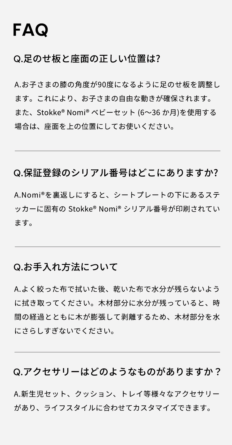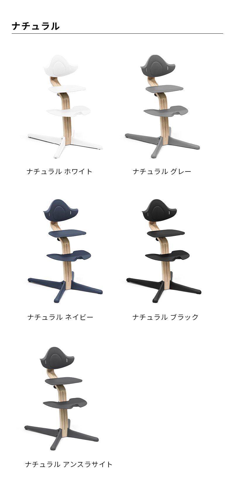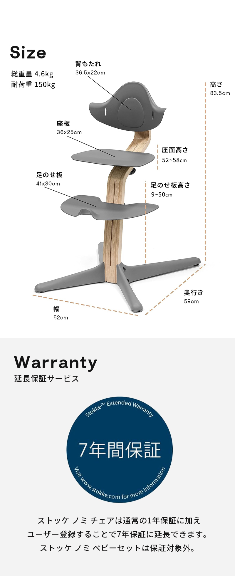 | ストッケ ノミ チェア 子どもの自由な動きをサポートするイス ストッケ ノミ チェアは、アクセサリー(別売り)を使用する事で新生児から大人まで、生涯お使いいただけます。 調整に工具が要らないシームレスな設計と、人間工学に基づいたデザインが年齢を問わず快適な座り心地を演出します。 ピーター・オプスヴィックは、お子さま自身が本能的に座りやすいと感じる理想のポジションを見つけられることで食事に集中しやすくなり、家族が一緒に楽しい食卓を囲むことができるという、トリップトラップと同じ考え方に基づきノミ チェアをデザインしました。 ・考え抜かれた機能がお子さまの自由な動きを妨げず、安全で快適な座り心地 ・お子さまの成長に合わせて、座面・足のせ板の高さ・奥行きを工具なしで無段階に調節でき、アクセサリー(別売り)を使用する事で新生児から大人まで、生涯使えるハイチェア ・4.6kgと軽量で移動が簡単、床掃除がしやすいようにテーブルにもかけられる仕様 ・曲線美が美しい北欧デザイン ・後方への転倒防止キャスターを搭載。欧州委員会2019年度「Product safety Silver Award 2019」を受賞 |