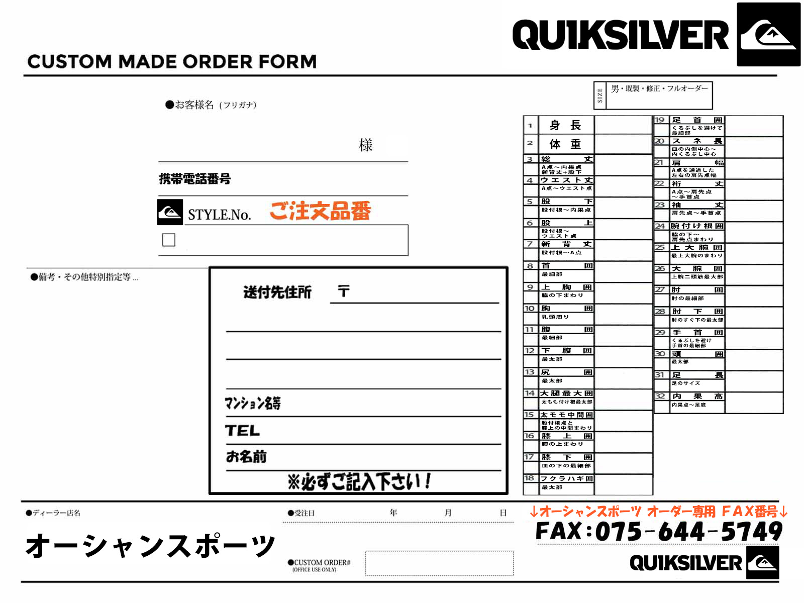★その他、クイックシルバーカタログ記載の全モデル/全品番の【ウェットスーツオーダー(オーダー対応)】が可能です。