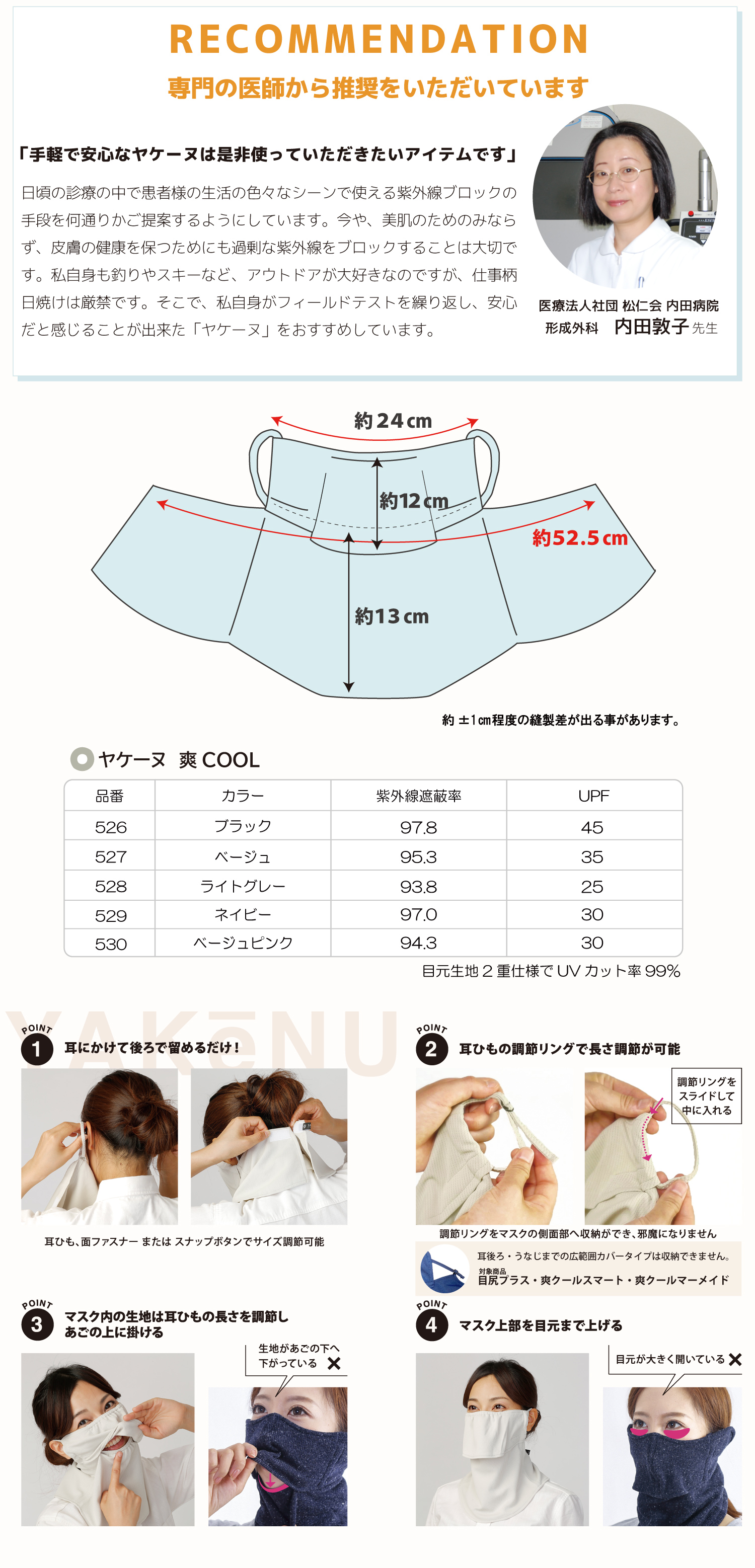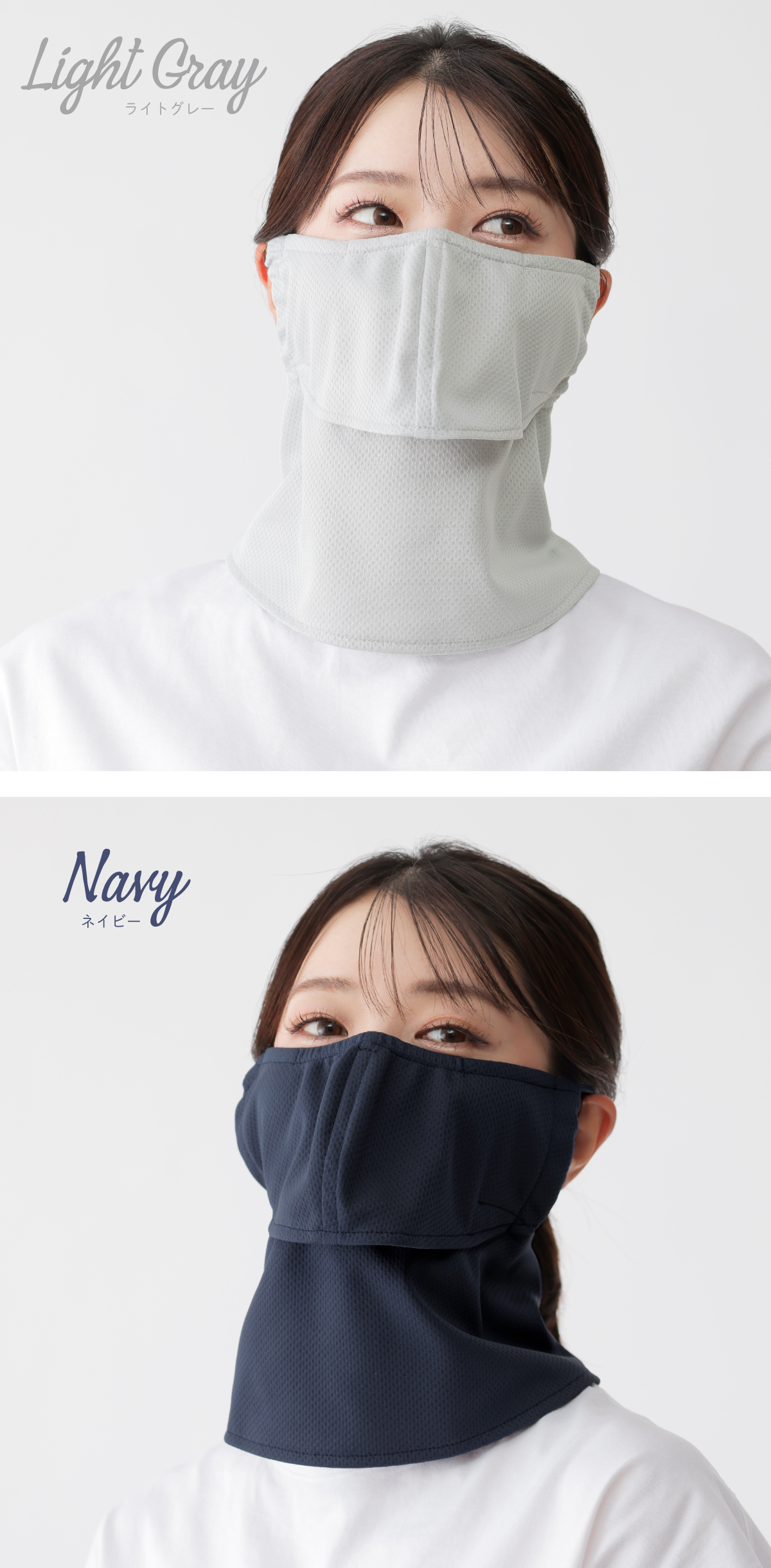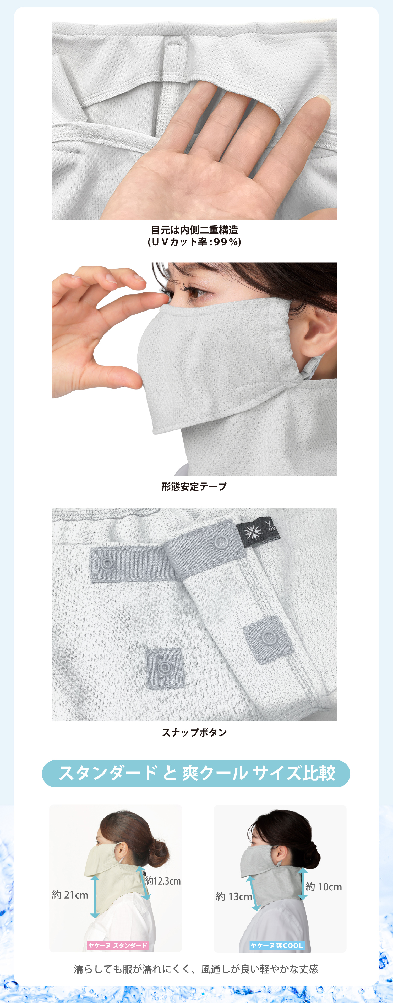 | 特徴 | 【構造】開口部を設けた上下2部式だから・・・ ★メガネがくもらない ★飲み物がそのまま飲める ★息苦しくない ◎目元は二重生地構造でUVカット率99% ◎気化熱を応用したクーリング素材を使用 ◎衣服が濡れにくいように少し短め ※UVカット効果は洗濯をしても変わりません! |