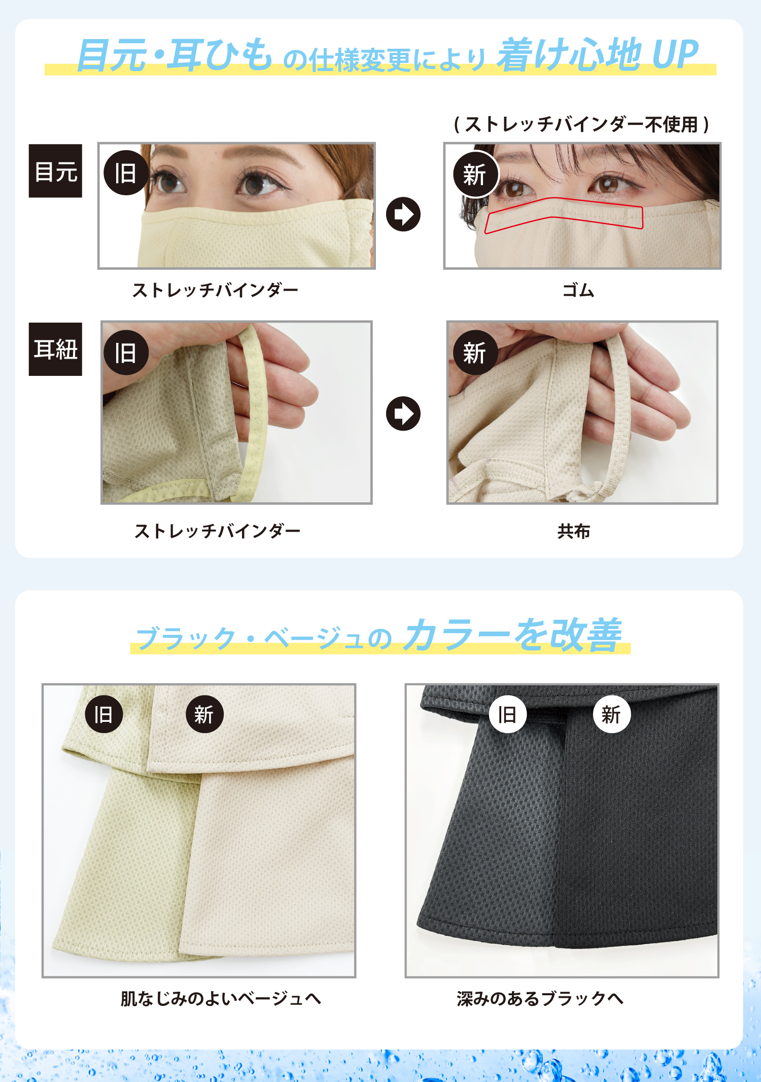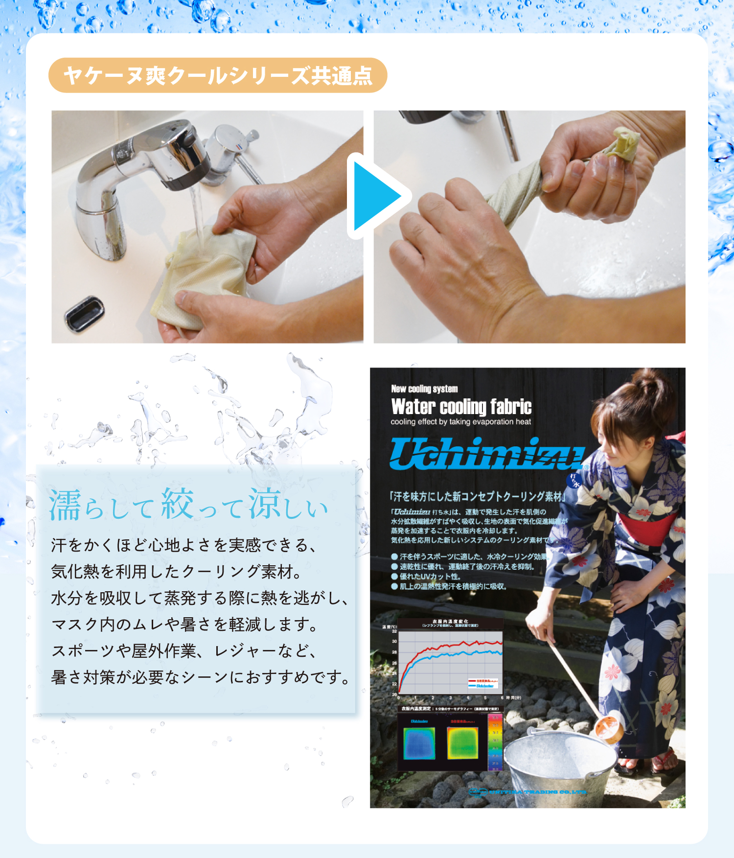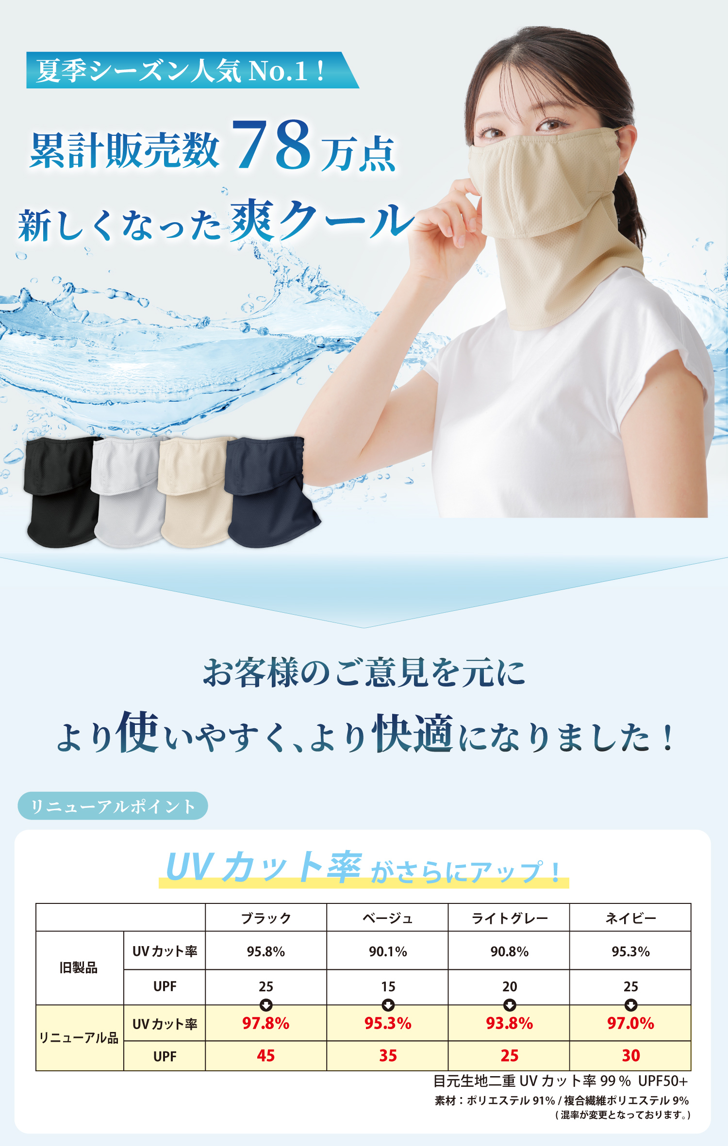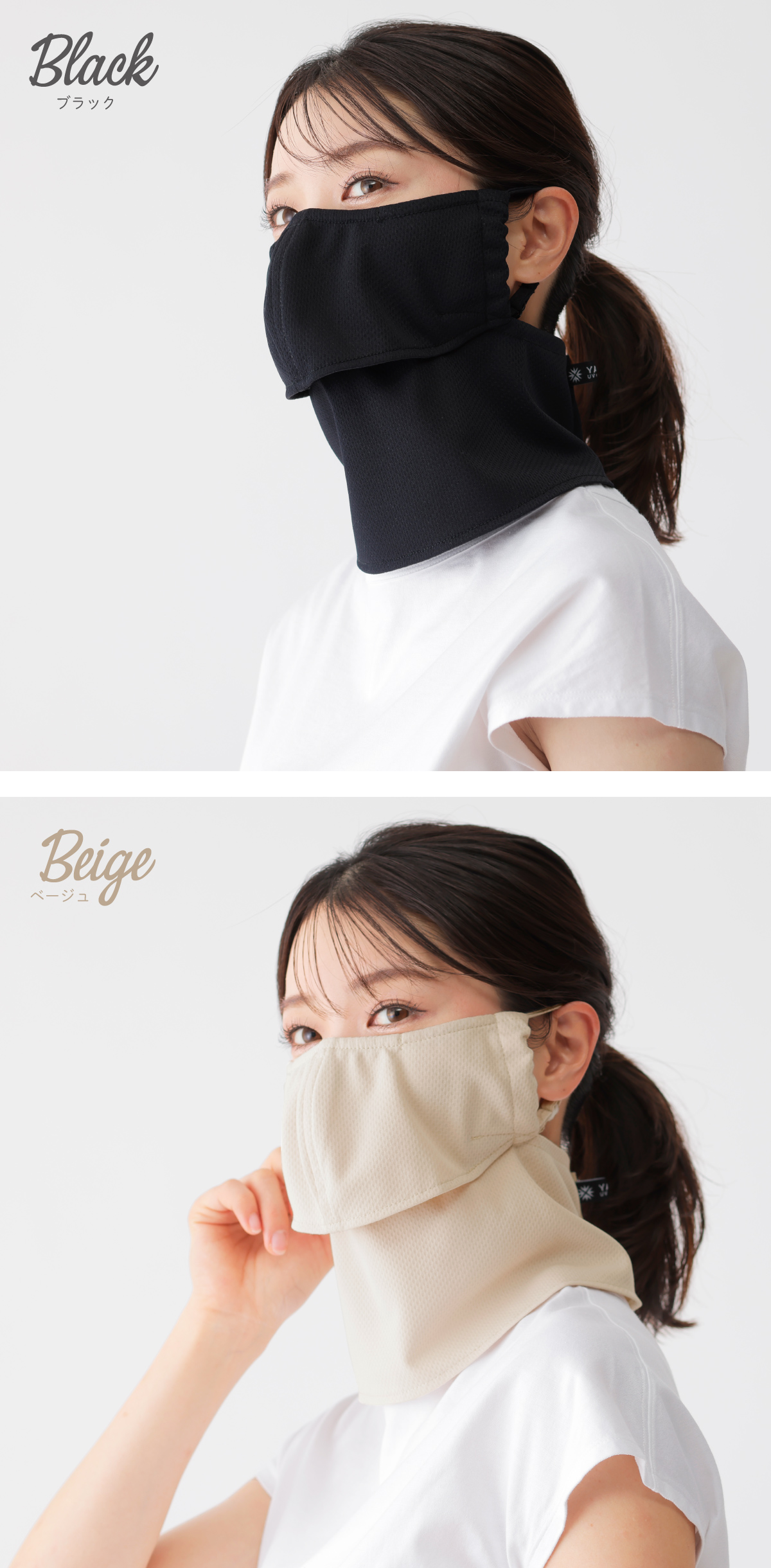 | 特徴 | 【構造】開口部を設けた上下2部式だから・・・ ★メガネがくもらない ★飲み物がそのまま飲める ★息苦しくない ◎目元は二重生地構造でUVカット率99% ◎気化熱を応用したクーリング素材を使用 ◎衣服が濡れにくいように少し短め ※UVカット効果は洗濯をしても変わりません! |